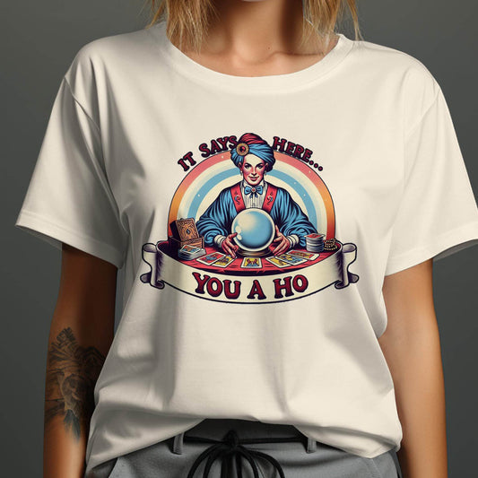 Funny Tarot T-Shirt, It Says Here You A Ho Shirt, Hilarious Graphic Tee, Comical tarot reader design, Unique Funny T-Shirt