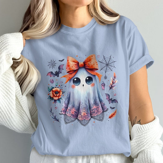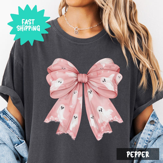 Cute Ghost Bow Design, Pink Ghost Bow on Comfort Colors T-Shirt, Halloween Shirt