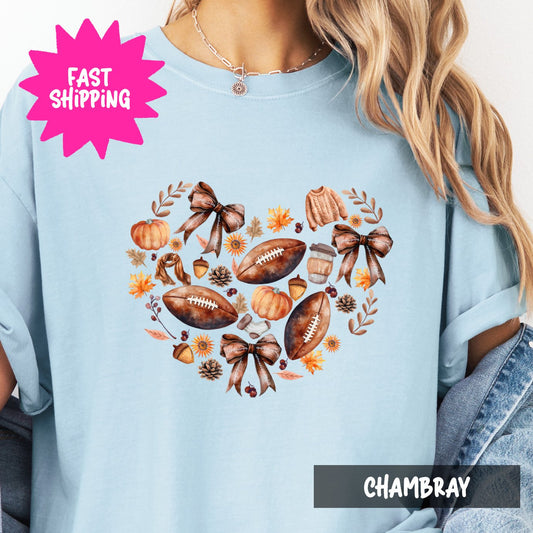Fall Football Graphic Comfort Colors T-Shirt, Cute Graphic Tee, Heart Shape Fall Design Comfort Colors Shirt