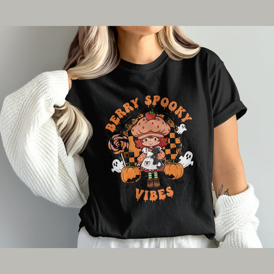 Berry Spooky Vibes T-Shirt, Cute Vintage Halloween Tee, Strawberry Shortcake Inspired, Witchy Cat, Ghost Shirt Comfort Colors T-Shirt