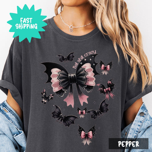 Bat Shit Crazy Bats and Bows Comfort Colors T-Shirt, Halloween T-Shirt, Gothic Bow T-Shirt