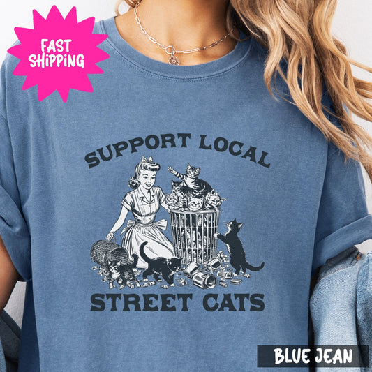 Support Local Street Cats Comfort Colors T-Shirt, Vintage Cat Lover Tee, Unisex Graphic Shirt, Retro Animal T-Shirt