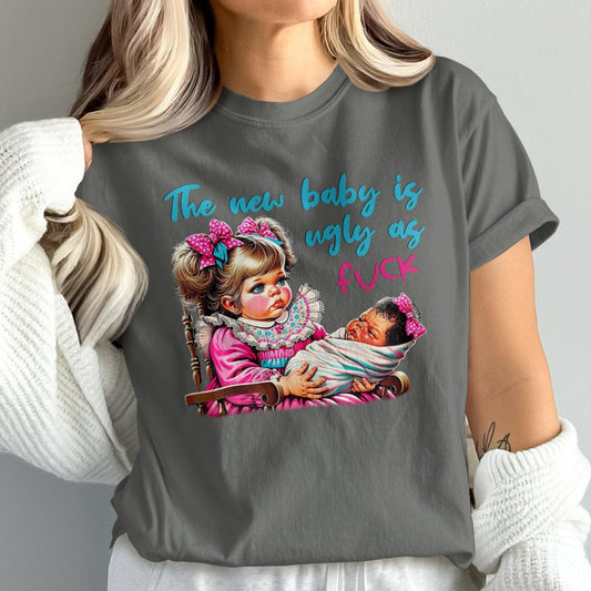 The New Baby Is Ugly As Fuck T-Shirt, Funny Sibling Humor Tee, Newborn Comedy Shirt, Baby Shower Gag Gift, Humorous Newborn Outfit