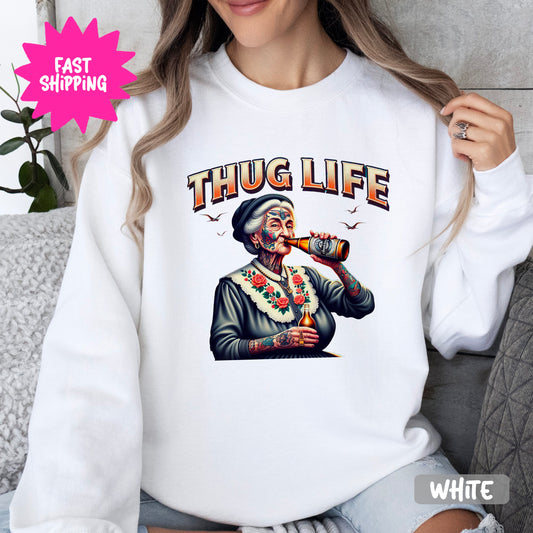 Thug Life Crewneck Sweatshirt, Funny Granny Graphic Sweatshirt, Streetwear Sweatshirt, Casual Hip Hop Clothing
