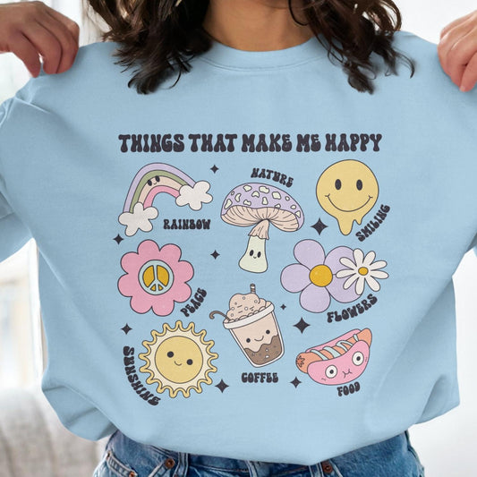 Things That Make Me Happy Sweatshirt, Sweatshirt, Rainbow Smiling Design, Cute Graphic Tee, Nature Inspired Apparel, Fun Colorful