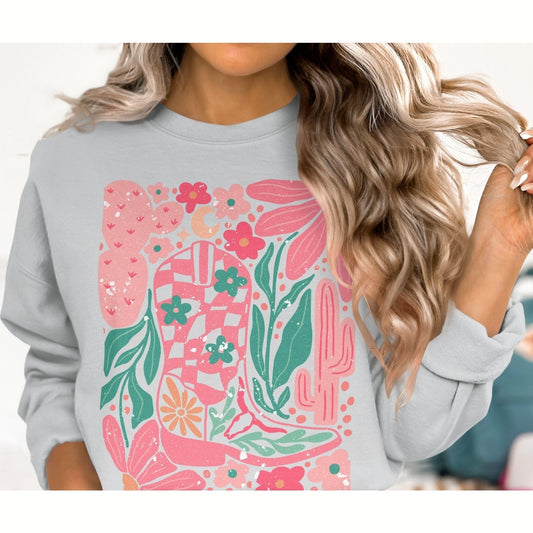 Western Floral Boot Boho Sweatshirt, Cowboy Boot Graphic Shirt, Cute Cactus and Flower Print Top, Colorful Western
