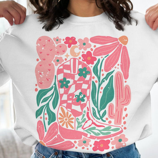 Western Boho Sweatshirt, Desert Floral Art, Cowboy Boot Design, Vintage Aesthetic, Pink and Green Cactus Crewneck