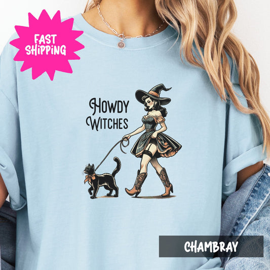 Vintage Howdy Witches Graphic Tee, Comfort Colors T-Shirt, Witchy Pin-Up Art, Cat Lover T-Shirt, Halloween Apparel