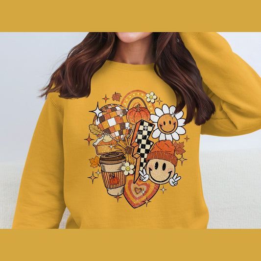 Cute Autumn Sweatshirt, Smiley Face and Fall Elements, Cozy Sweatshirt, Retro Fall Fashion, Trendy Autumn Top