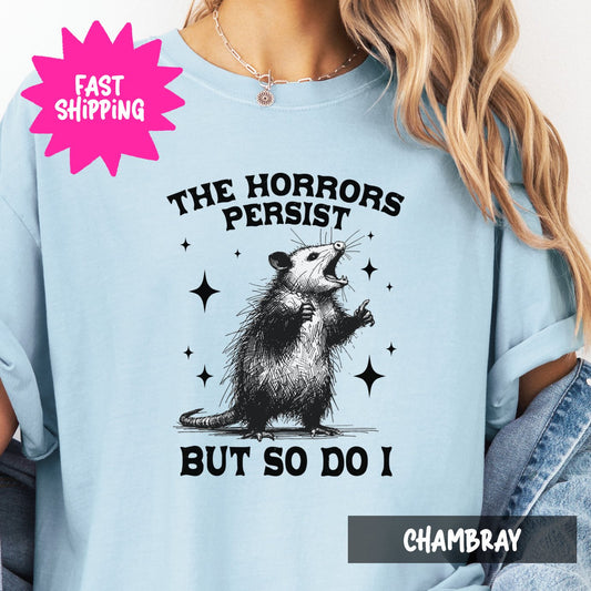 Funny Possum Comfort Colors T-Shirt, The Horrors Persist But So Do I, Unique T-Shirt, Funny Graphic Tee, Vintage Style Tee