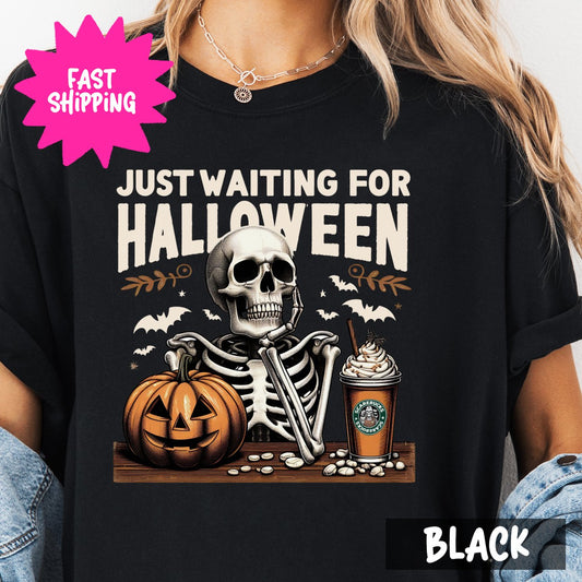 Just Waiting for Halloween T-Shirt, Skeleton Pumpkin Halloween Shirt, Comfort Colors T-Shirt