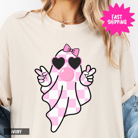 Ghost Graphic Comfort Colors T-Shirt, Cute Halloween Theme, Pink Checkered Ghost, Heart Sunglasses, Peace Signs, Fun Graphic Tee