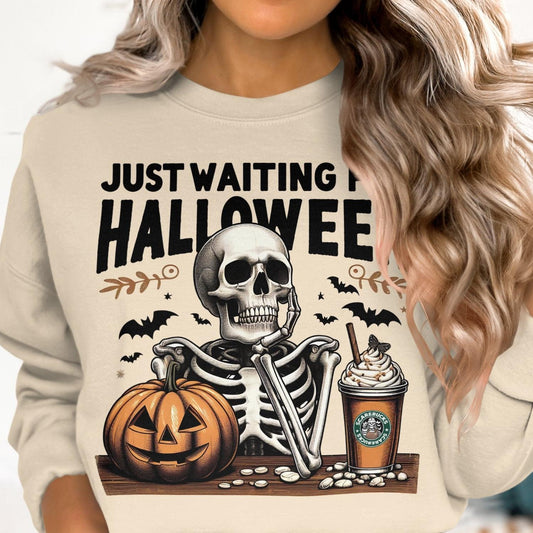 Just Waiting for Halloween Skeleton Pumpkin Sweatshirt