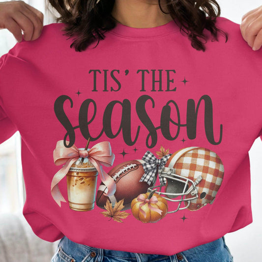 Tis' The Season Sweatshirt, Football, Pumpkin, Fall, Autumn, Holiday, Hot Drink, Graphic Tee, Seasonal Apparel, Cozy Style
