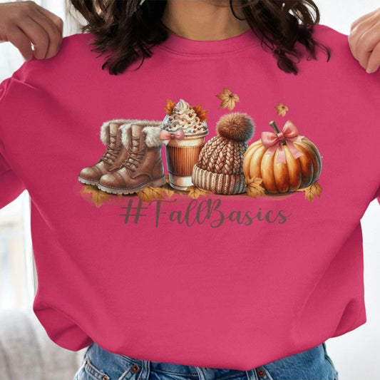 Fall Basics Sweatshirt with Cute Autumn Boot, Pumpkin, Hat, and Cup Design
