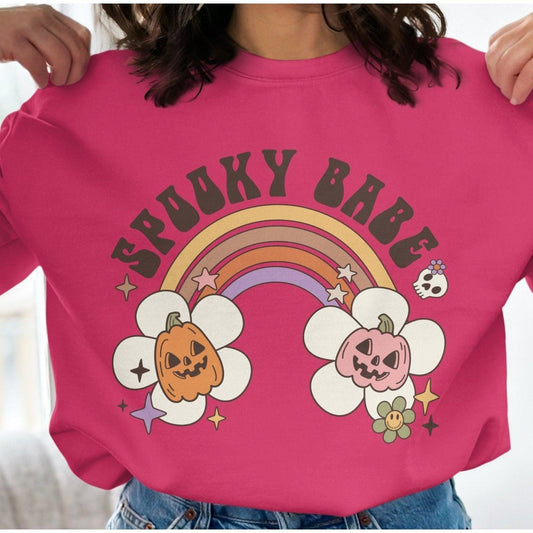Spooky Babe Sweatshirt with Rainbow, Floral Design, Halloween Vibes