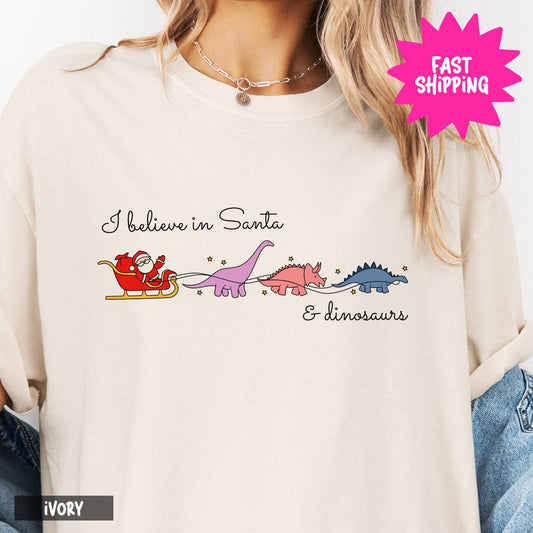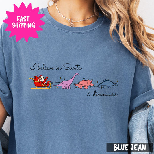 I Believe in Santa and Dinosaurs Comfort Colors T-Shirt, Cute Christmas Tee, Dinosaur Lover Shirt, Funny Holiday Top