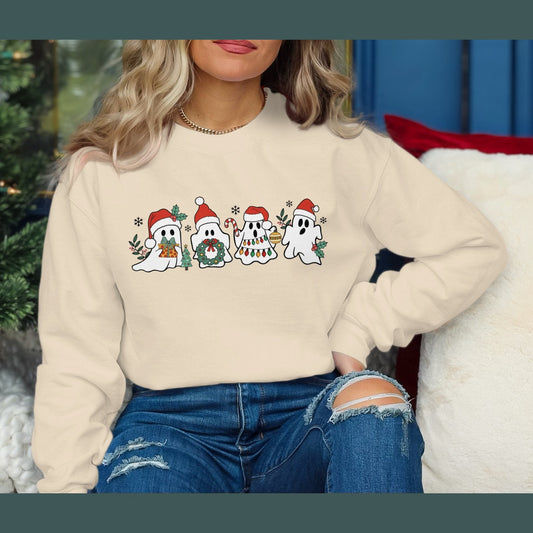Christmas Ghosts in Santa Hats Holiday Crew Neck Sweatshirts