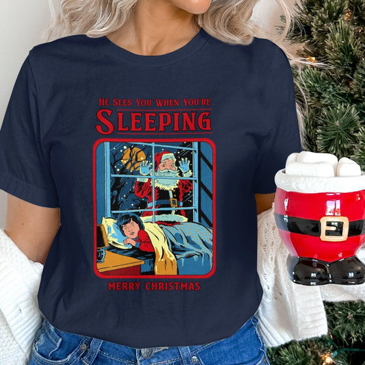 Funny Unhinged Santa T-Shirt, He Sees You When You're Sleeping