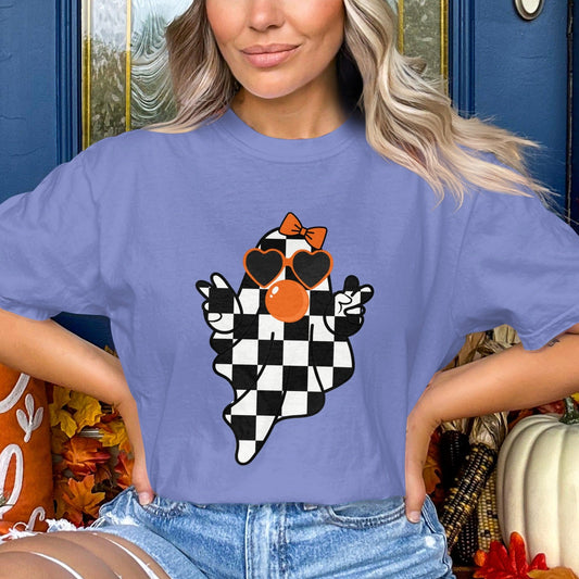 Spooky Season Checkered Ghost Heart Sunglasses Bow Comfort Colors T-Shirt
