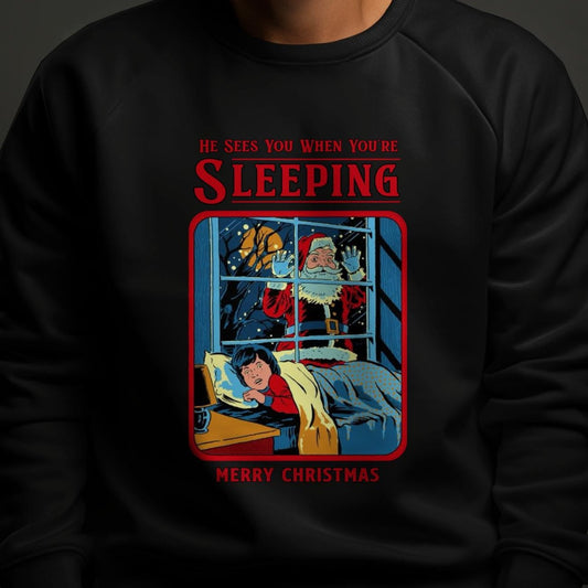 He Sees You When You Are Sleeping Dark Humor Christmas Sweatshirt Sarcastic Funny Holiday Graphic Unisex Pullover Father Xmas