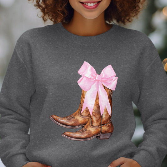 Trendy Cowboy Boots Graphic Pink Bow Detail Sweatshirts