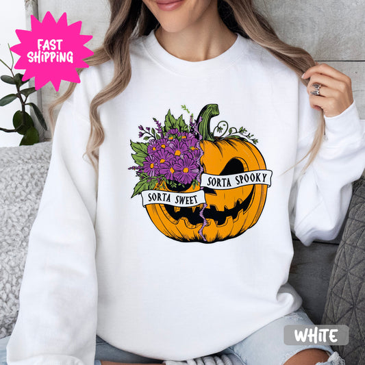 Sorta Sweet Sorta Spooky Pumpkin Sweatshirt, Halloween Crewneck, Floral Pumpkin Design, Fall Sweater, Cozy Autumn Attire