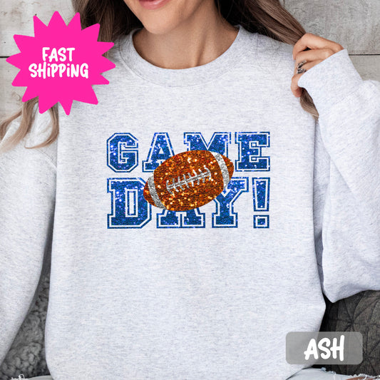 Game Day Football Crewneck Sweatshirt, Blue Glitter Letters, Comfortable and Stylish, Perfect for Sports Fans