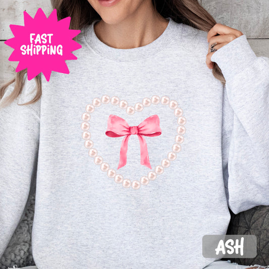 Heart Pearl Design Crewneck Sweatshirt, Pink Bow Graphic Sweater, Cozy Warm Pullover, Fashionable Casual Top