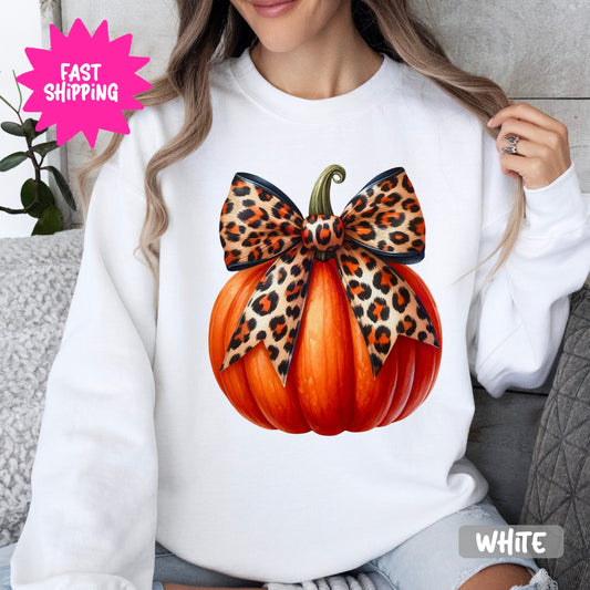 Leopard Print Bow Pumpkin Sweatshirt, Trendy Fall Crewneck Sweatshirt, Cozy Autumn Fashion, Cute Halloween Top