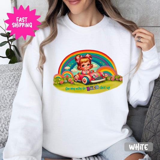 Cute Vintage Rainbow Girl Riding Car Crewneck Sweatshirt, Funny Graphic Sweatshirt, Colorful Retro Pullover