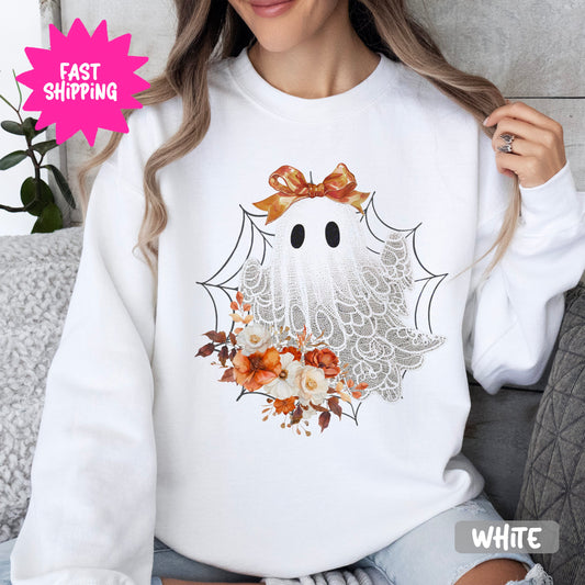 Ghost Lace Design Sweatshirt, Floral and Web Crewneck, Cute Halloween, Fall Fashion, Spooky Season Apparel