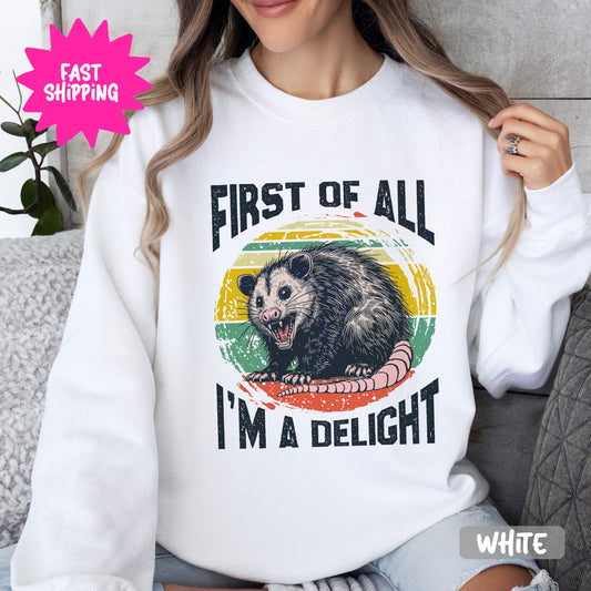 Graphic Possum Crewneck Sweatshirt, First of All I'm a Delight, Vintage Style, Unisex Cozy Pullover, Fun Animal Design