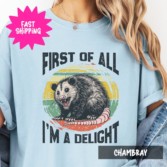 Funny Possum T-Shirt, First Of All I'm A Delight Graphic Tee, Comfort Colors T-Shirt, Cute Animal Retro Shirt