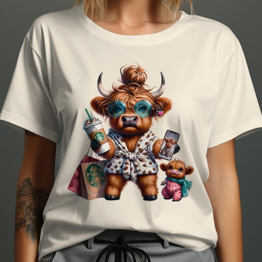 Cute Highland Cow Shopping T-Shirt, Funny Starbucks Animal Art T-Shirt, Mother's Love Cow T-Shirt