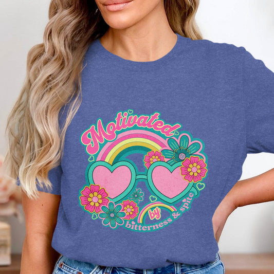 Motivated Graphic T-Shirt, Fun Retro Design T-Shirt, Colorful Flower Power T-Shirt, Cute Heart Sunglasses Tee