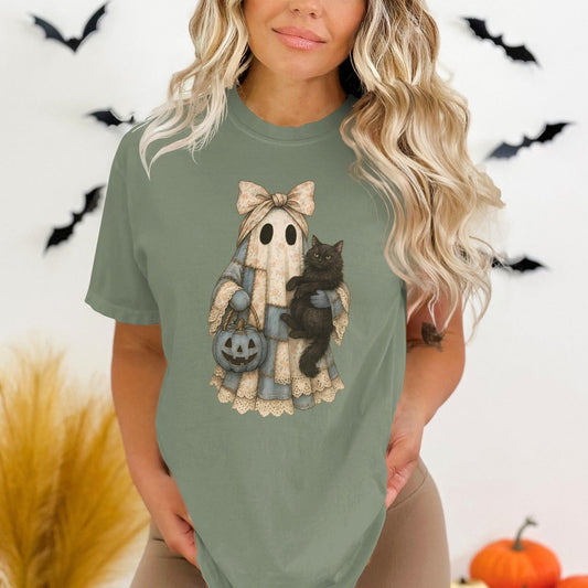 Patchwork Ghost With Black Cat Halloween Pumpkin Comfort Colors T-Shirt