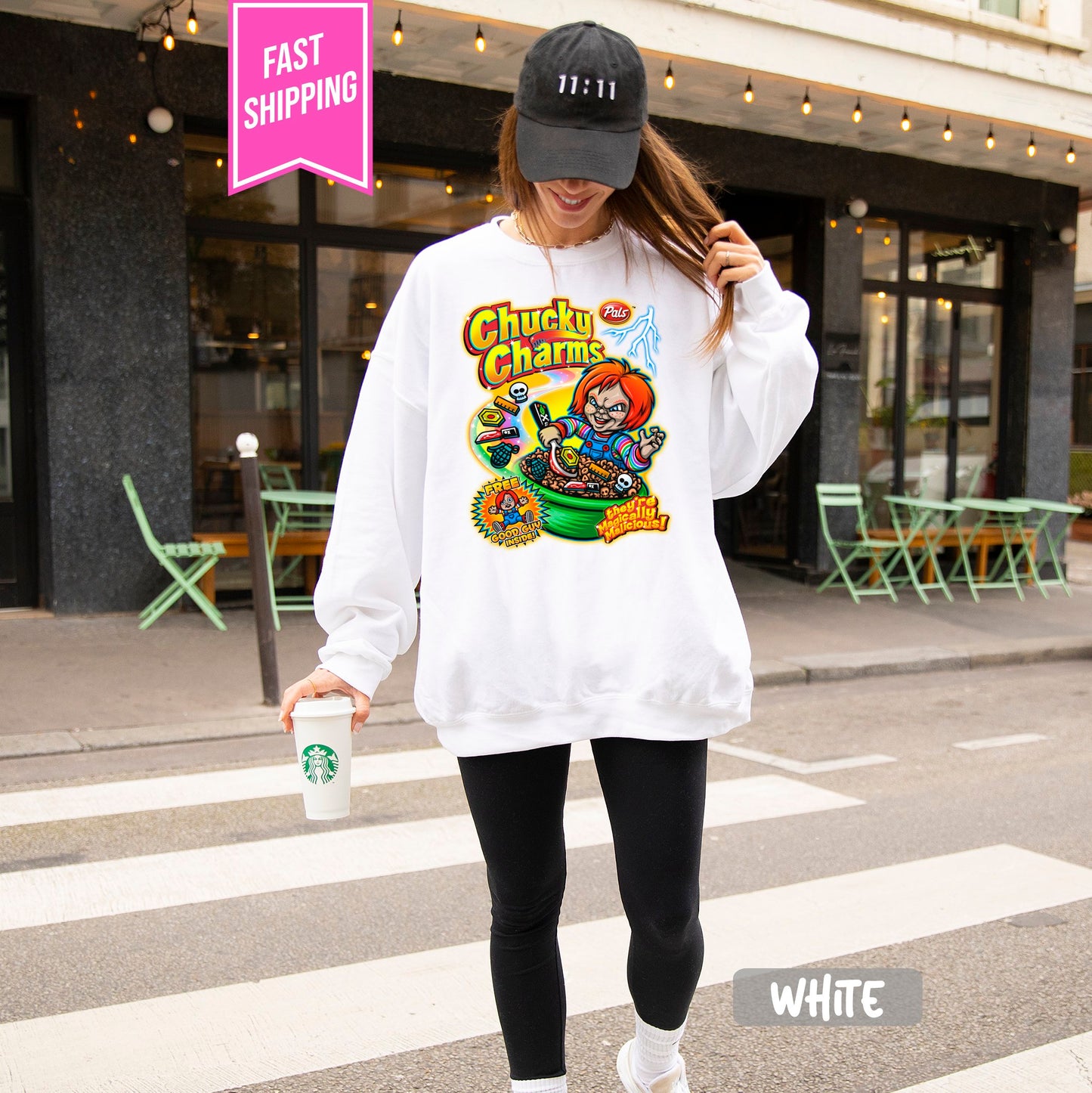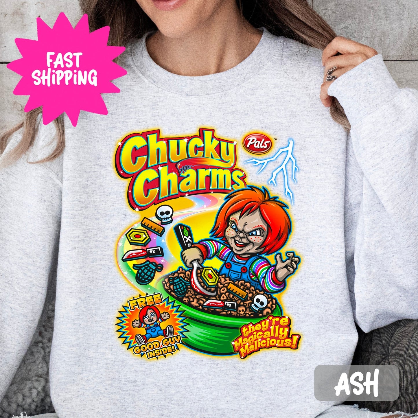 Get your hands on these Chucky Charms sweatshirts featuring a playful design with vibrant colors and fun graphics perfect for any fan.