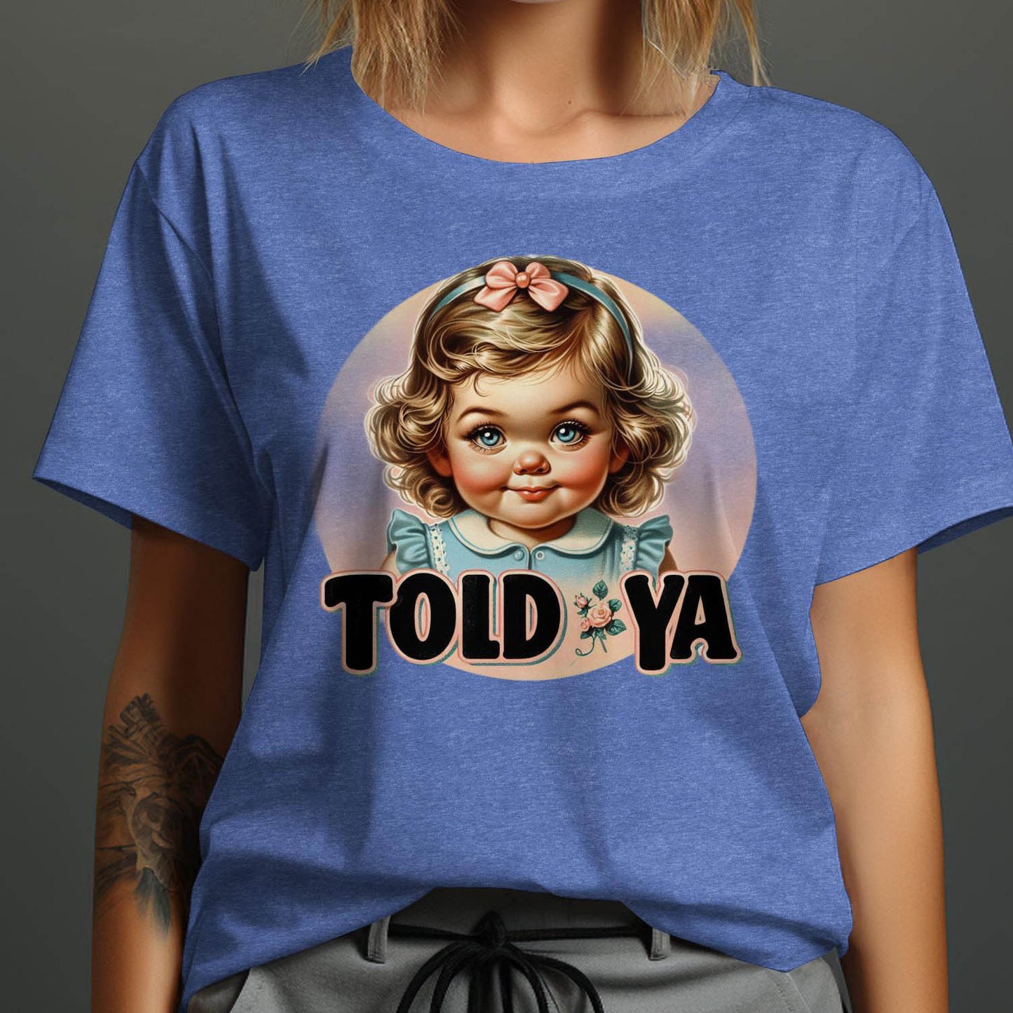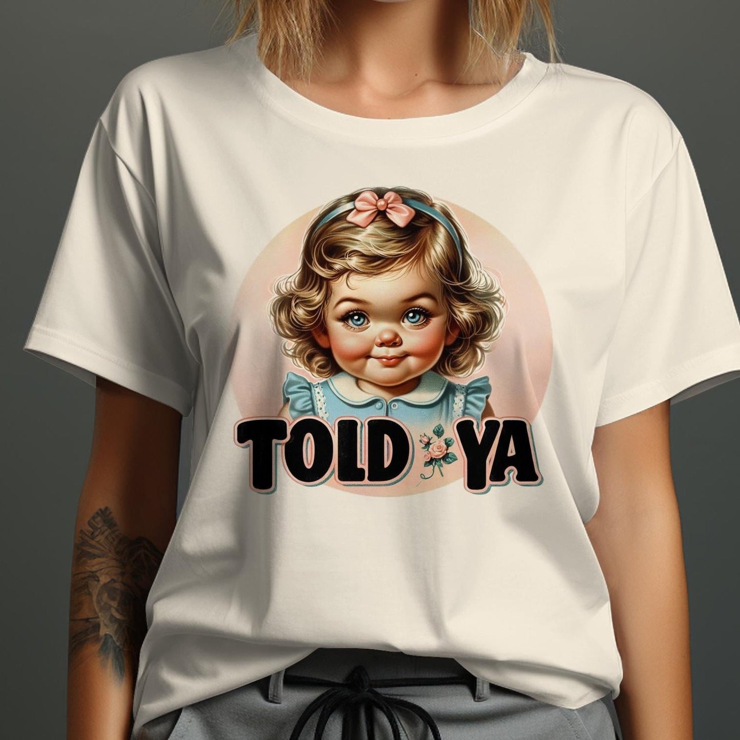 This adorable Cute Vintage Baby Girl T-Shirt features a charming retro design with a cute baby and the phrase "Told Ya." Perfect for adding a touch of humor and style to your wardrobe. Ideal for casual outings or as a unique gift for friends and family. Available in various sizes to ensure a perfect fit. Show off your fun personality with this unique T-shirt!