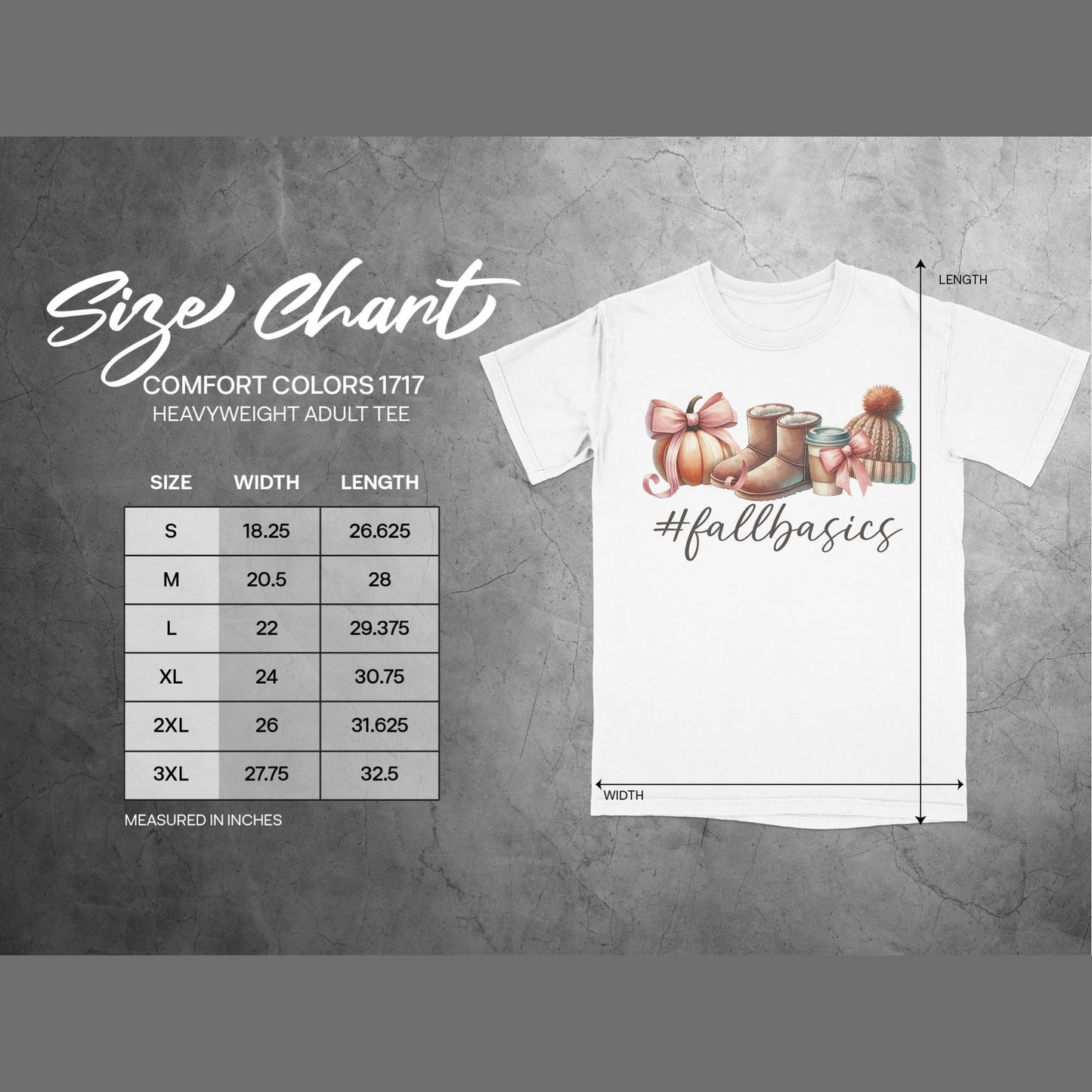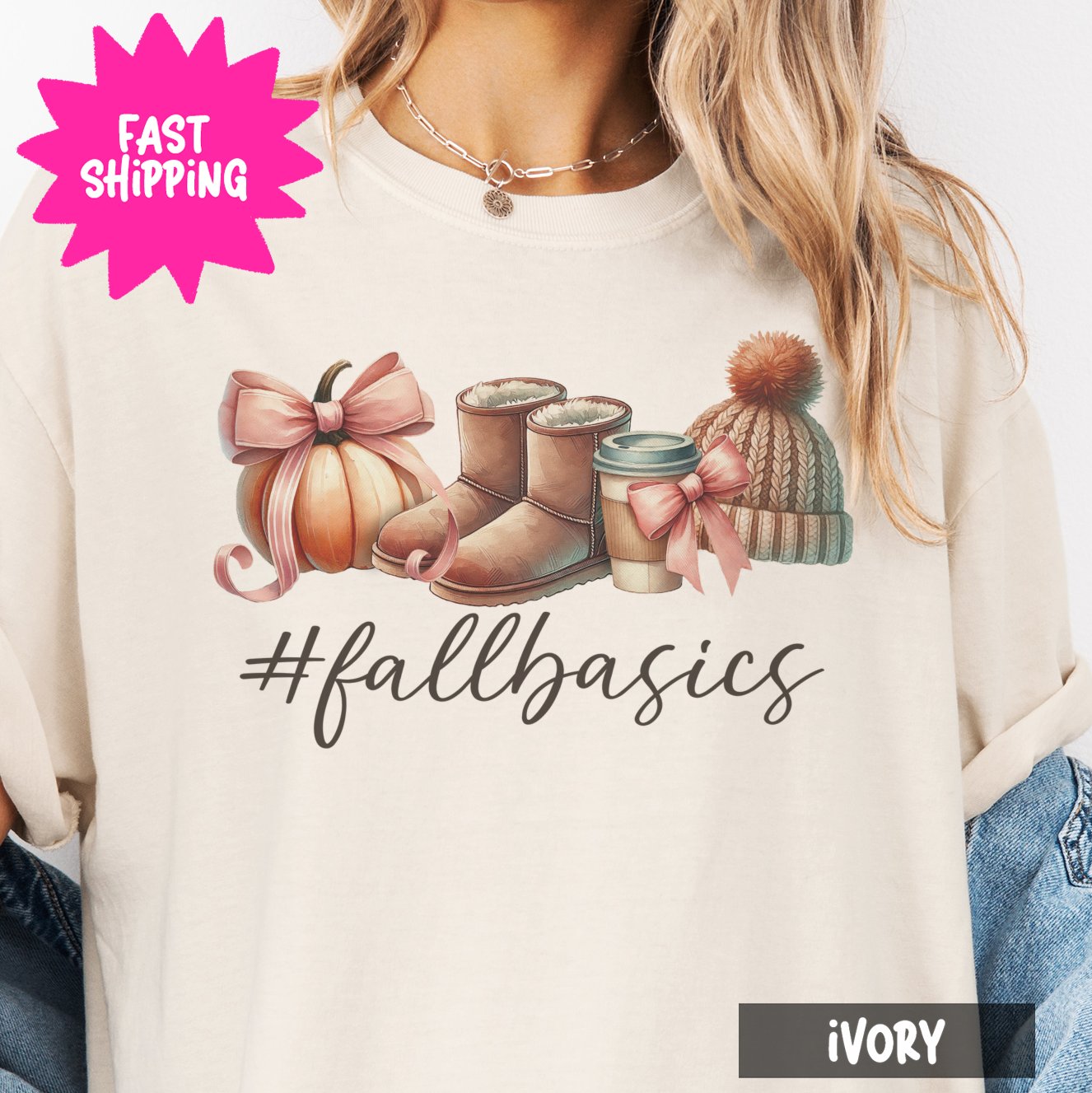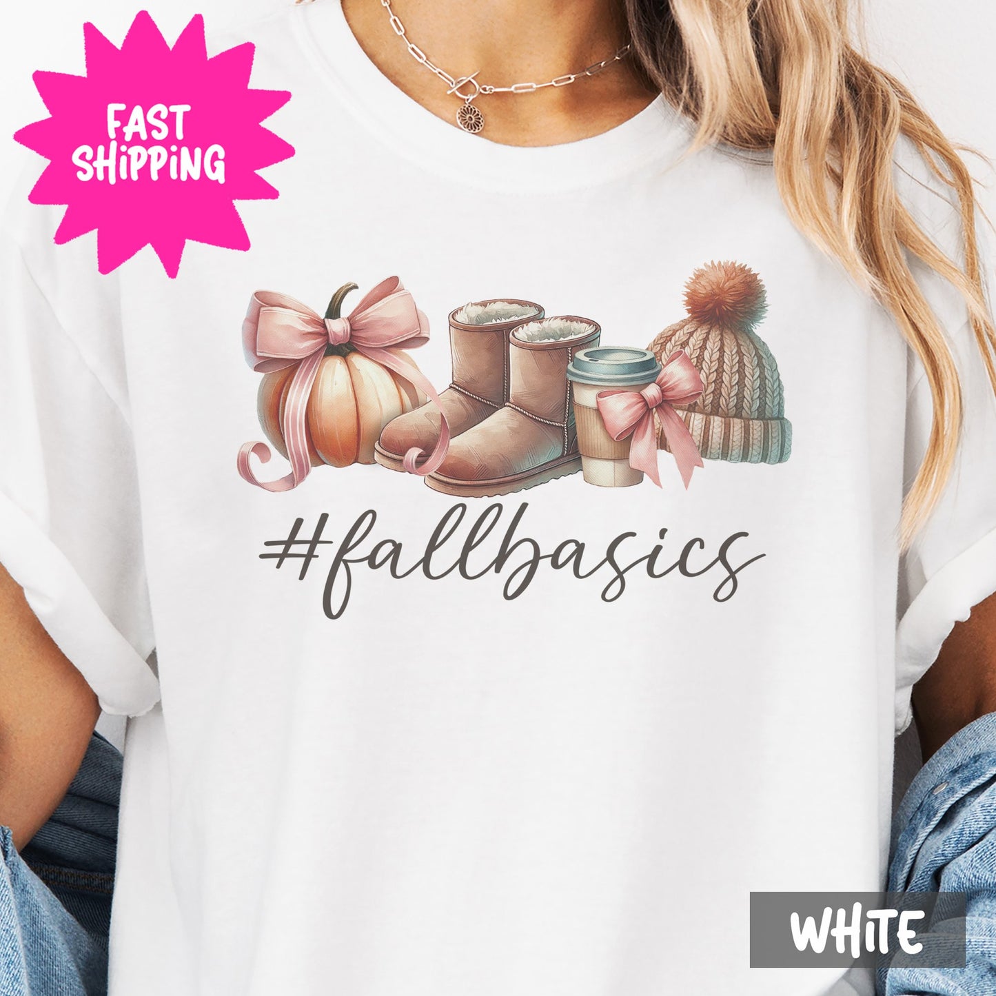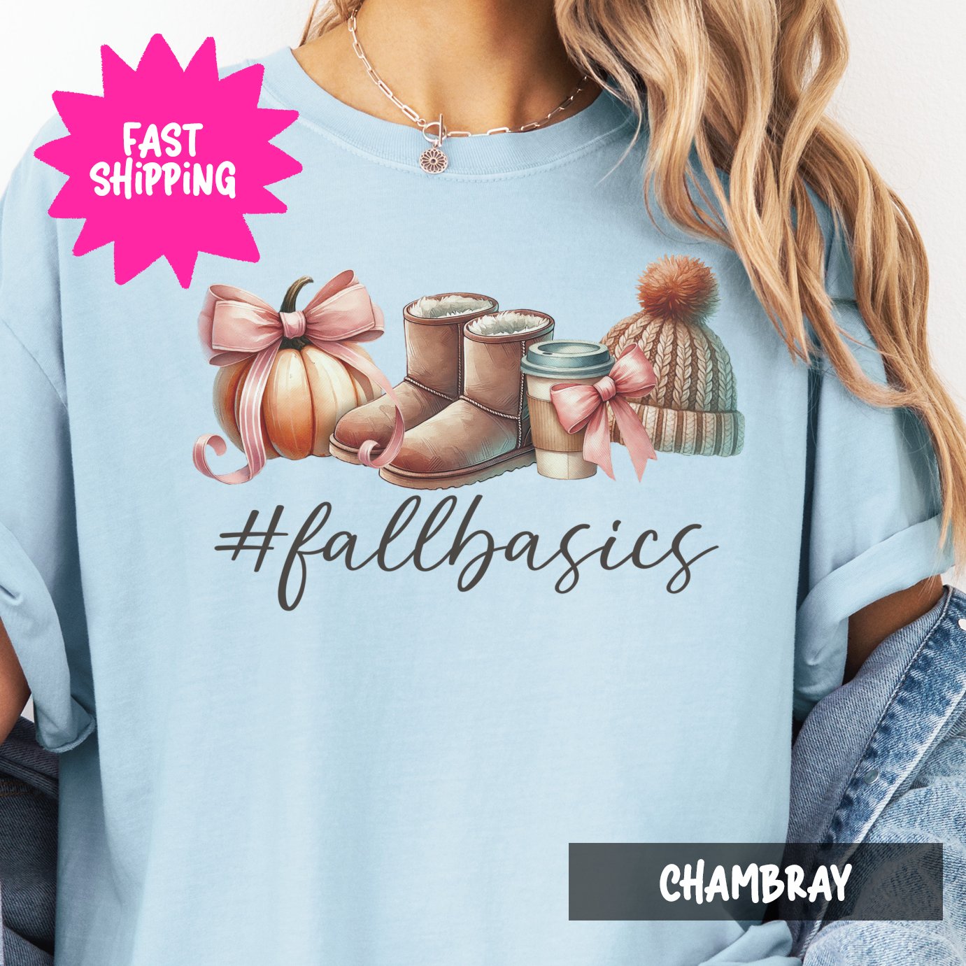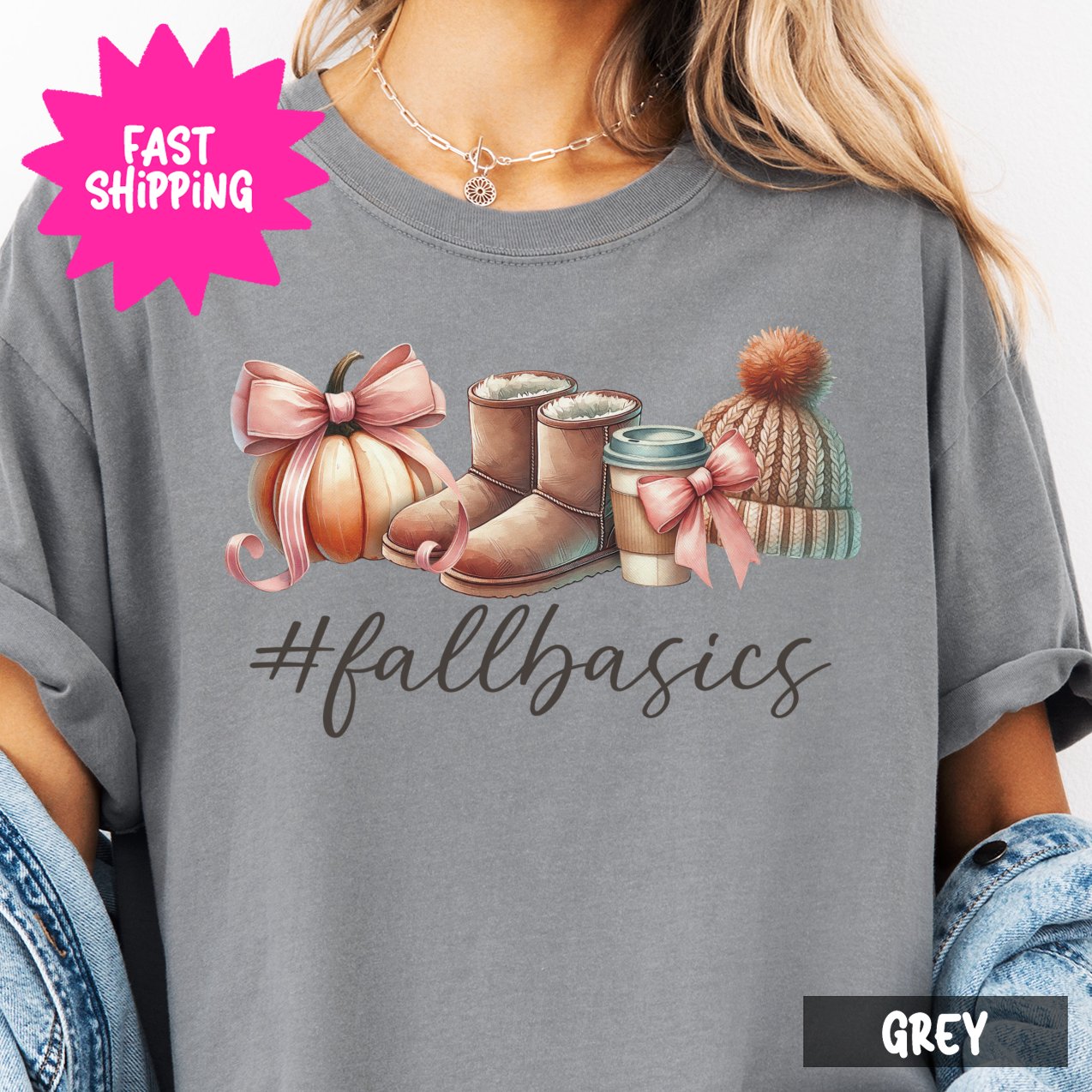 Fall Basics T-Shirt With Pumpkin, Boots And Hat Design On Comfort Colors T-Shirt