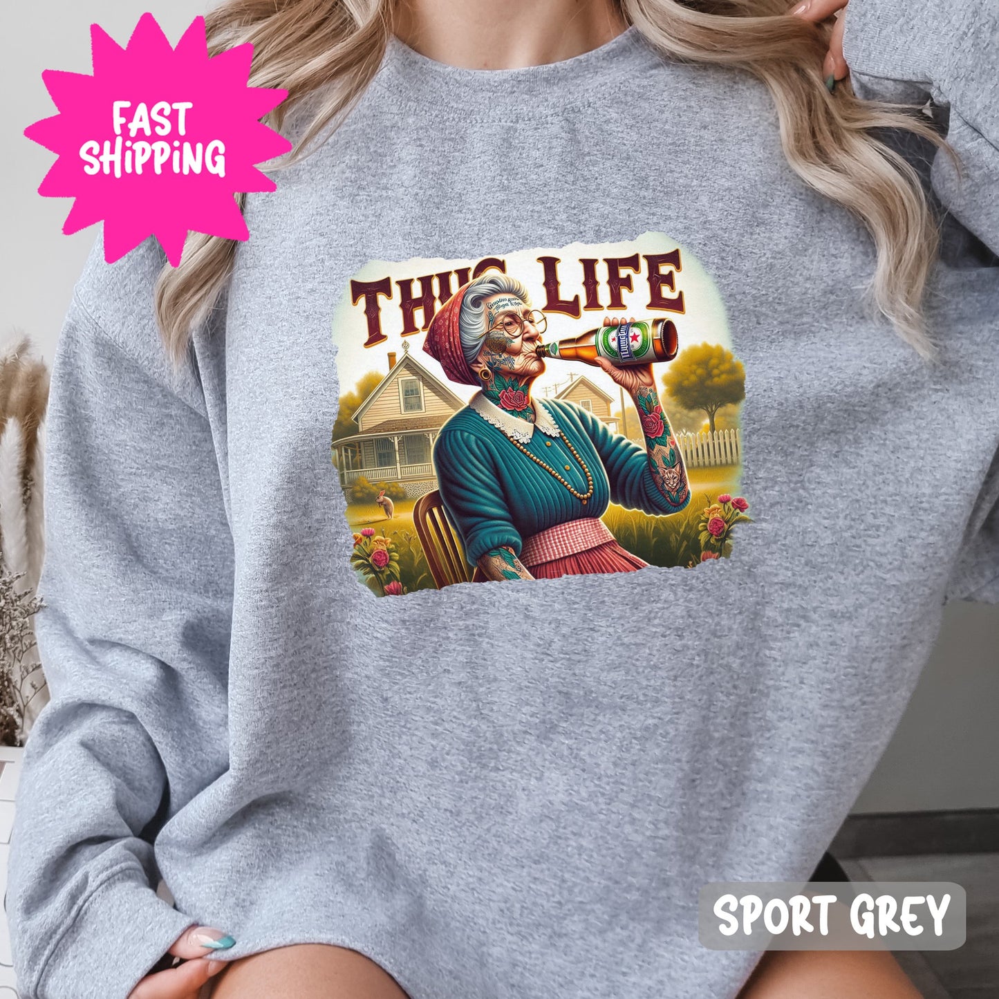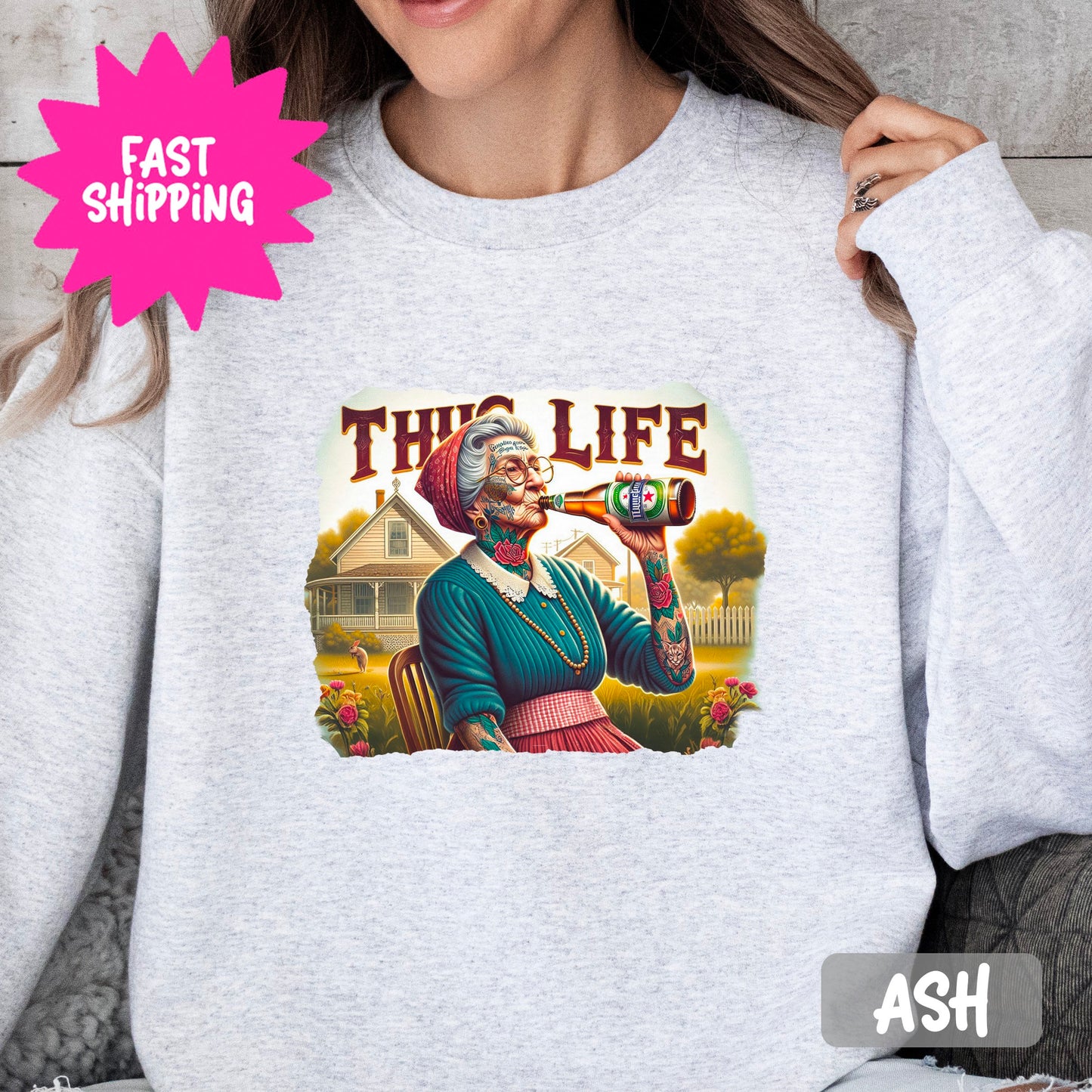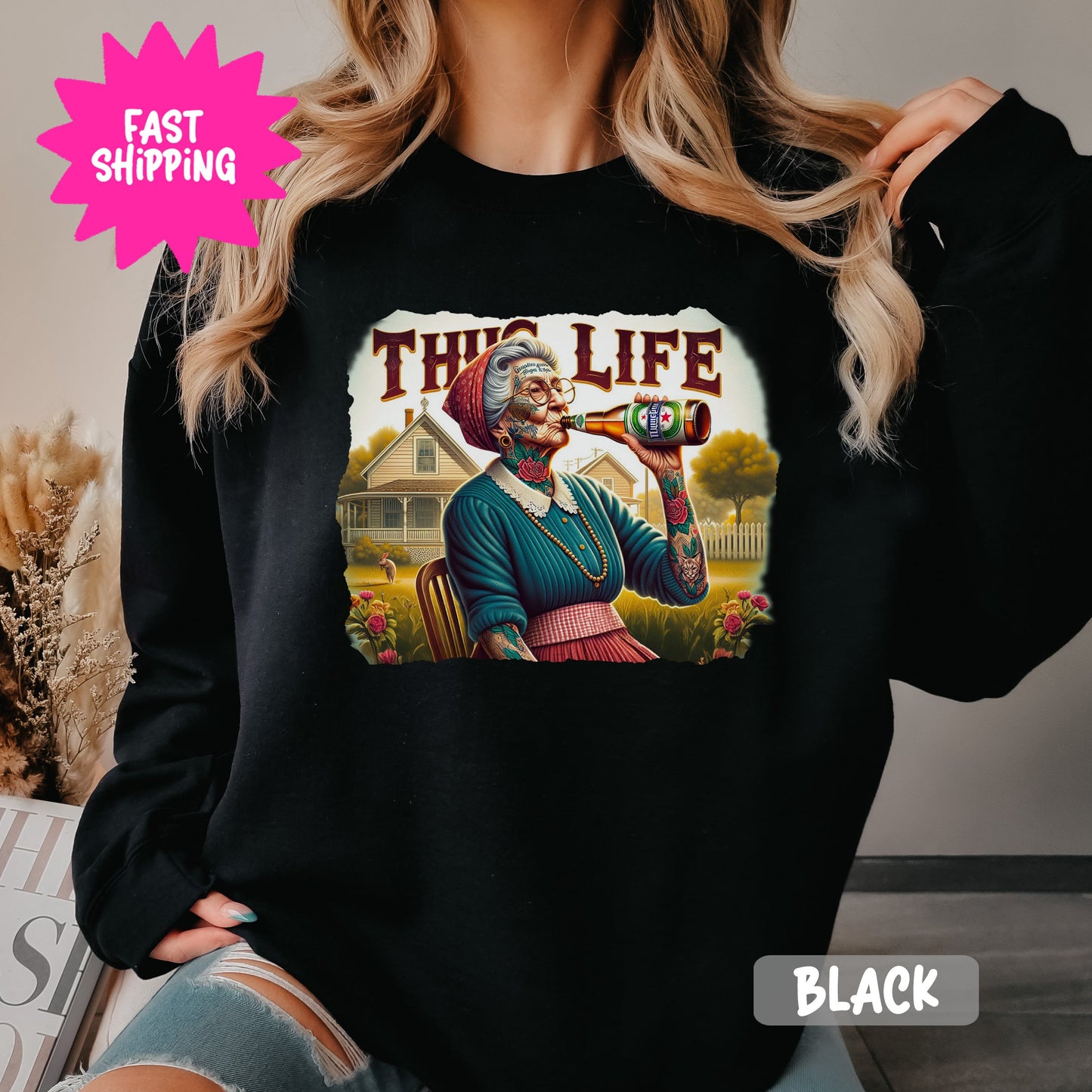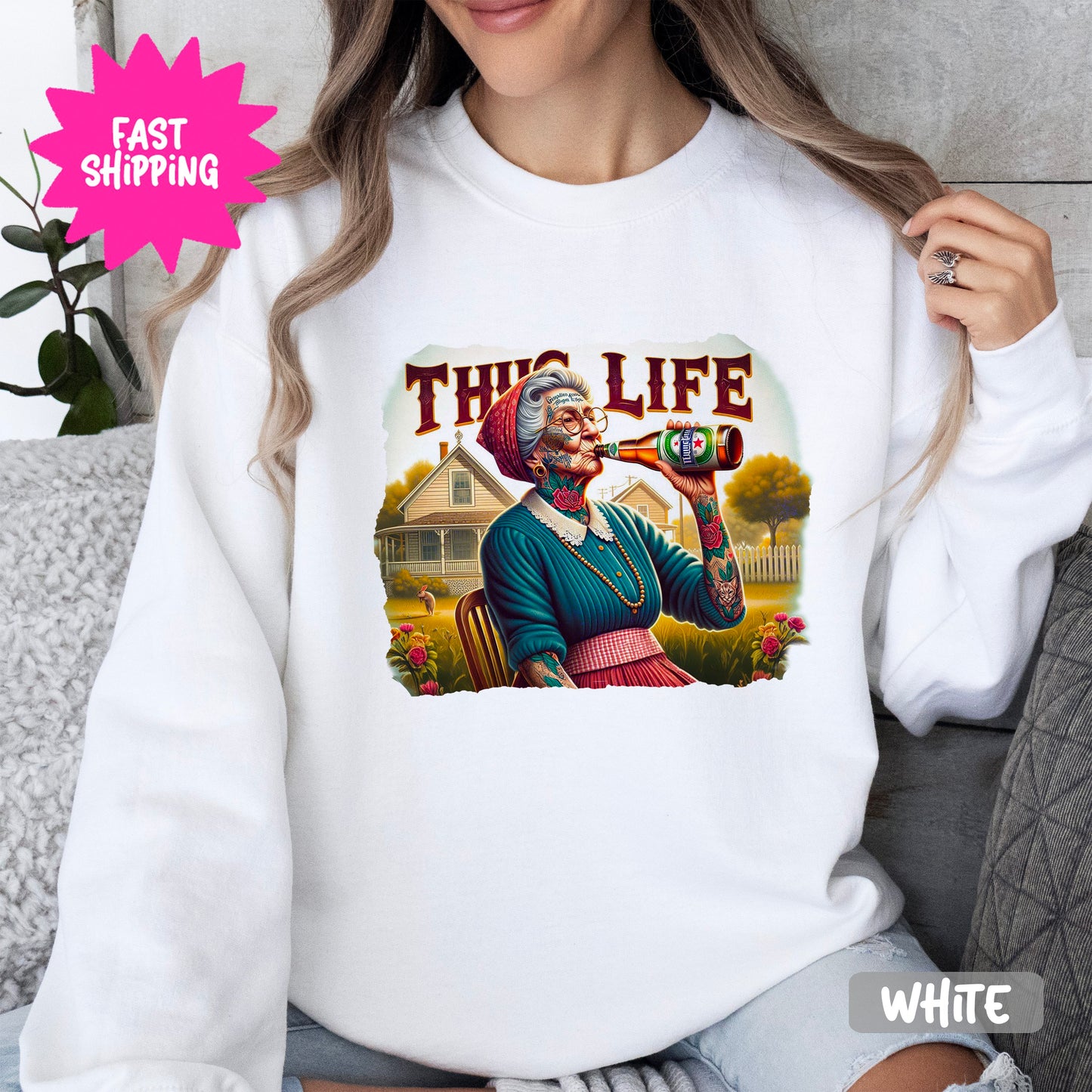 Funny Grandma Thug Life Crewneck Sweatshirt, Vintage Drinking Graphic Sweater, Unique Tattoo Art Pullover For Adults