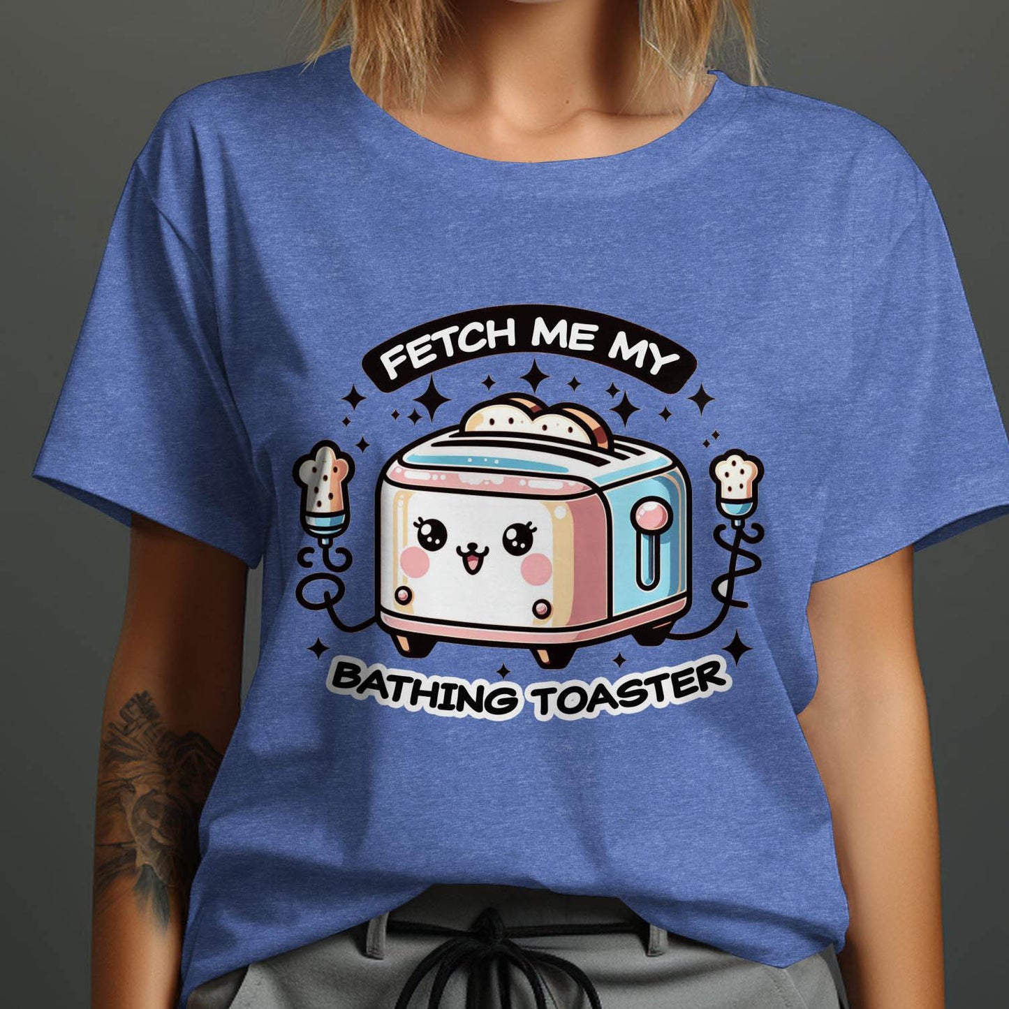 This funny kawaii T-shirt features an adorable toaster graphic with the phrase "Fetch Me My Bathing Toaster." Perfect for those who love cute and quirky designs, this T-shirt brings a playful touch to your wardrobe. Ideal for casual wear, it makes a great gift for friends or a unique addition to your collection.