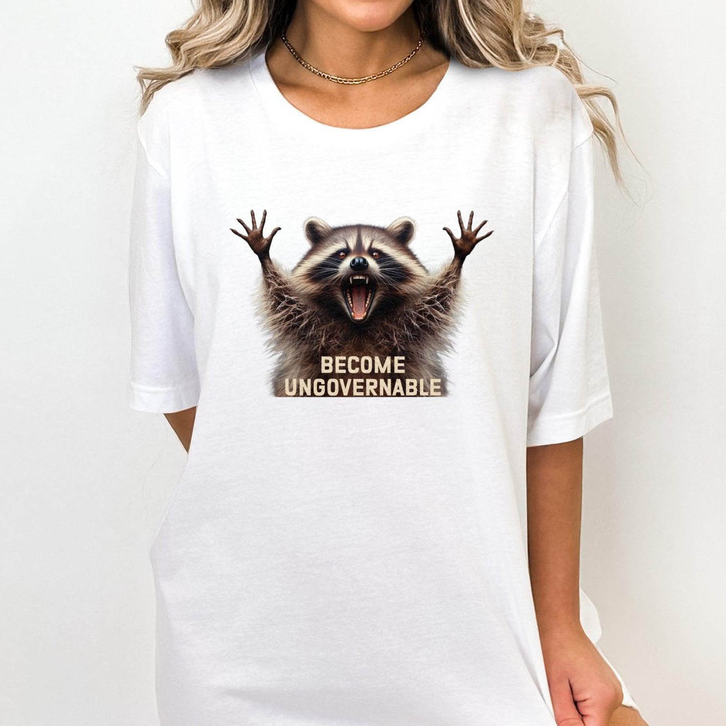 This funny raccoon T-Shirt features a hilarious and bold "Become Ungovernable" graphic. Perfect for adding a touch of humor to any outfit, this unisex graphic tee is a great conversation starter. Ideal for casual wear, it makes a unique gift for friends and family who love quirky and funny statements. Show off your playful personality with this eye-catching T-shirt.