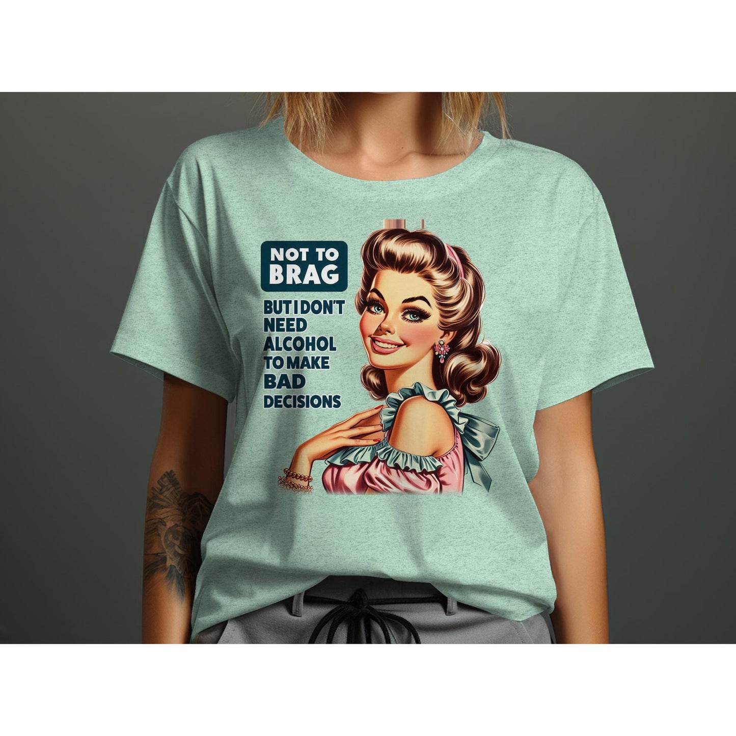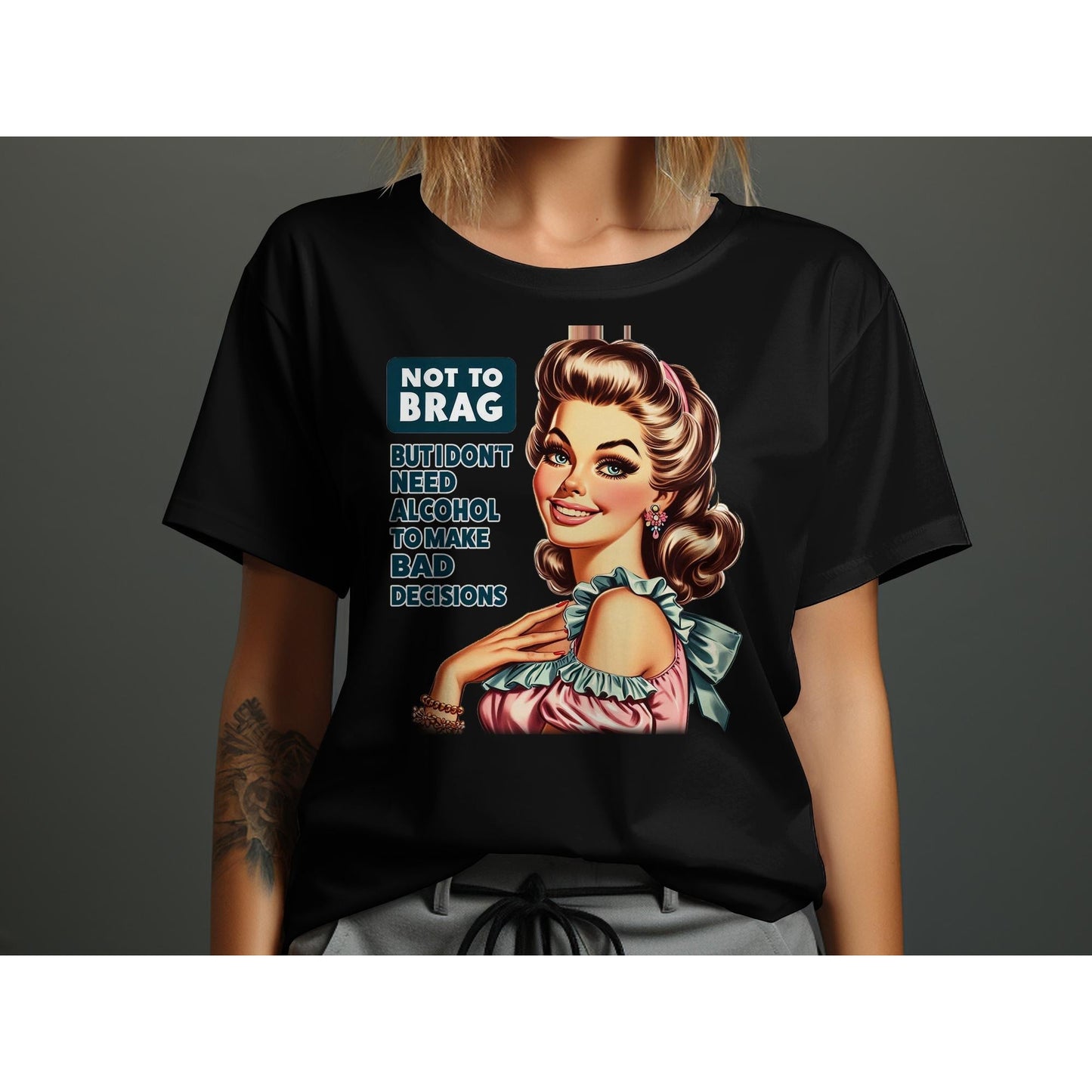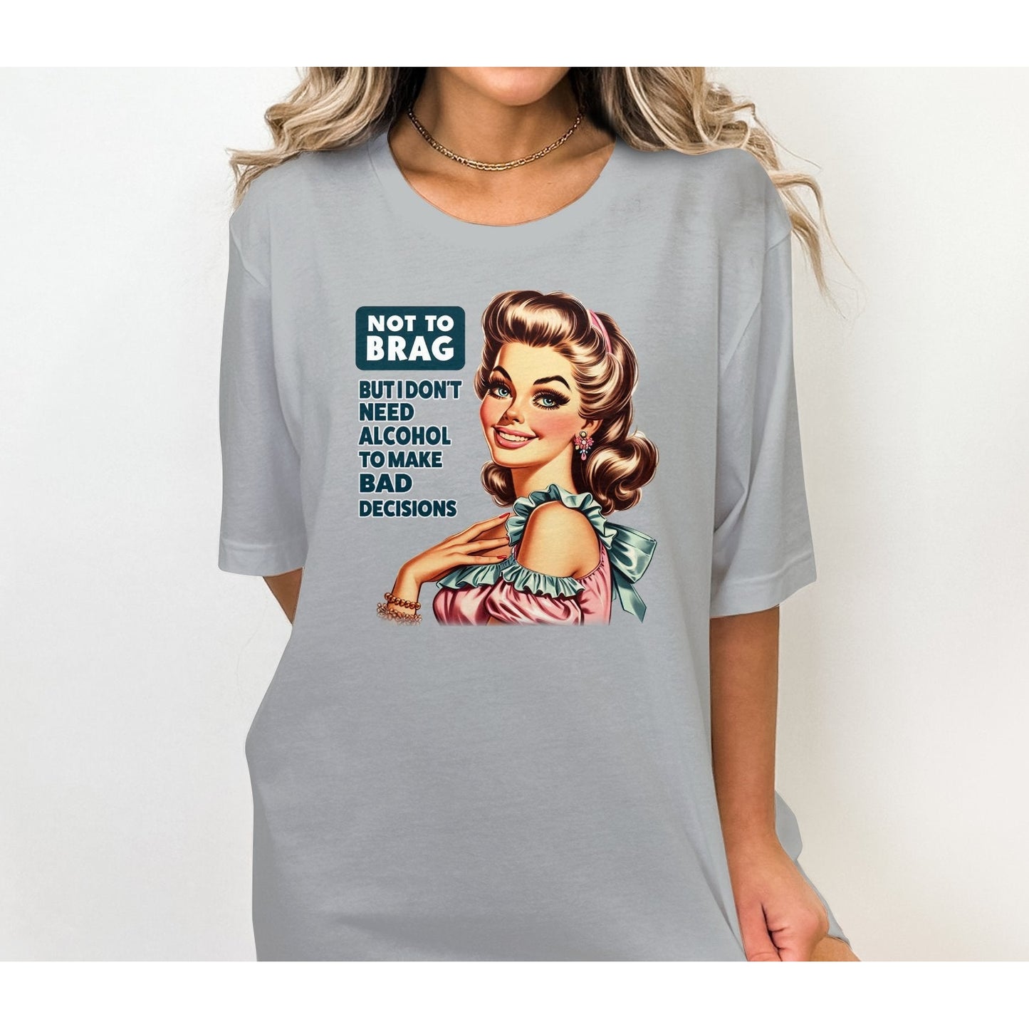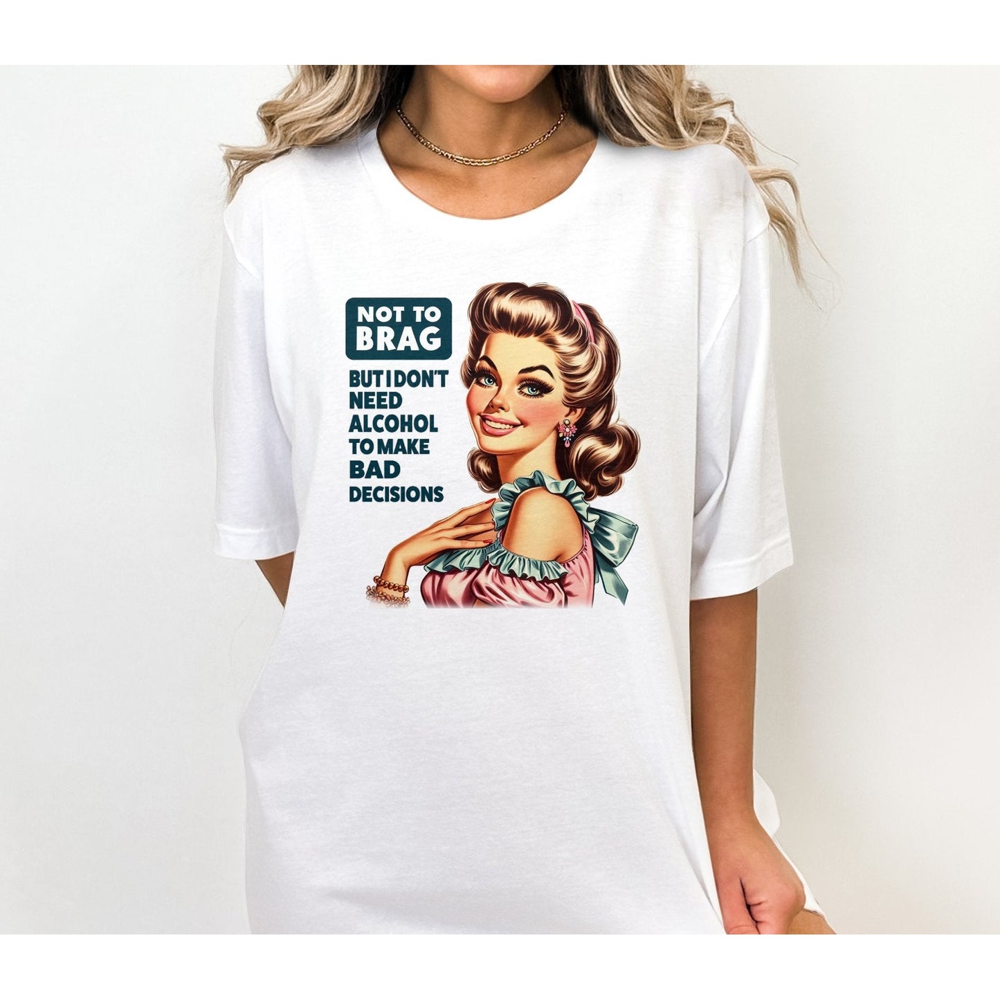 This funny vintage-style T-Shirt features the hilarious phrase "Not To Brag But I Don't Need Alcohol To Make Bad Decisions." Perfect for those who enjoy witty and humorous statements. Great for casual wear, parties, or as a fun gift.