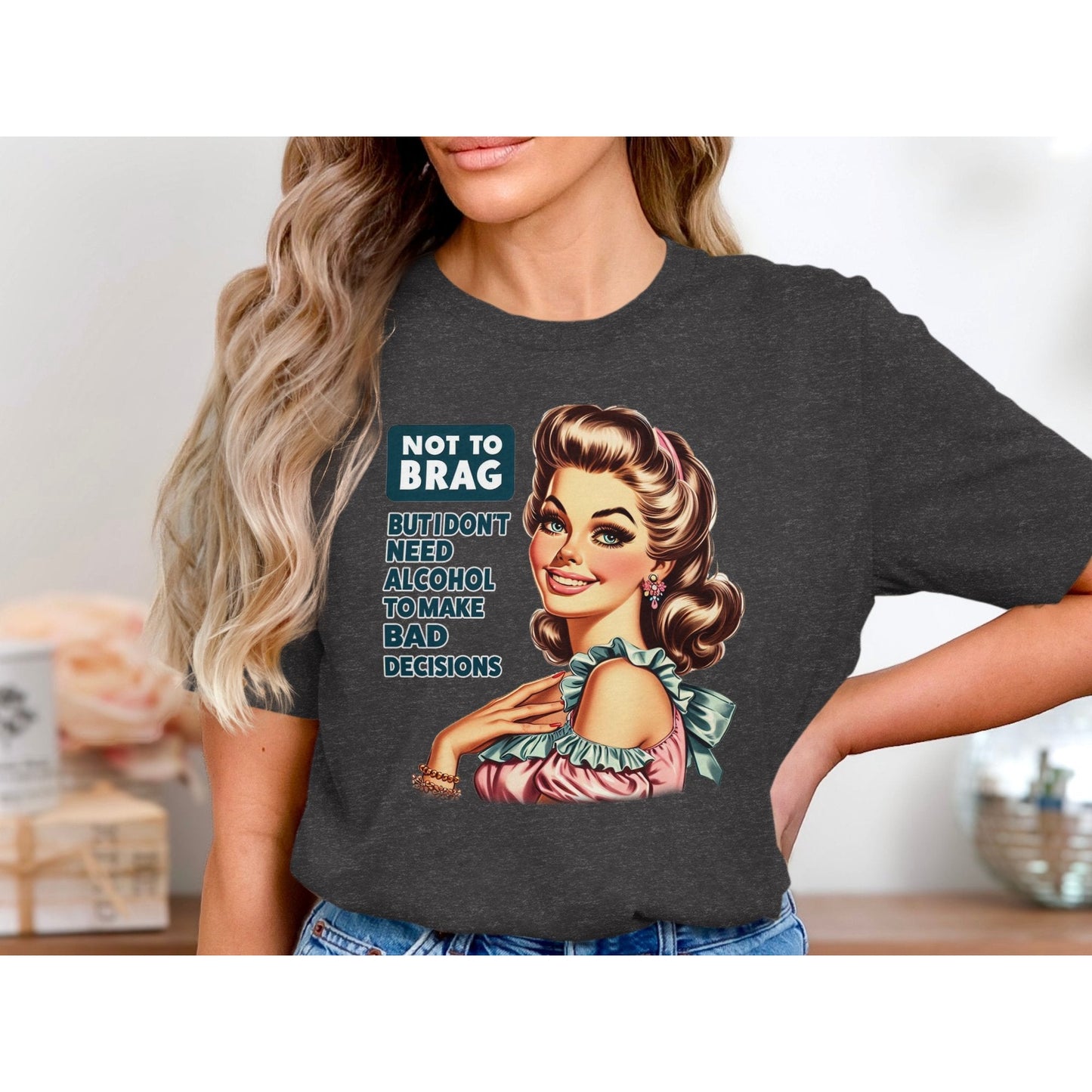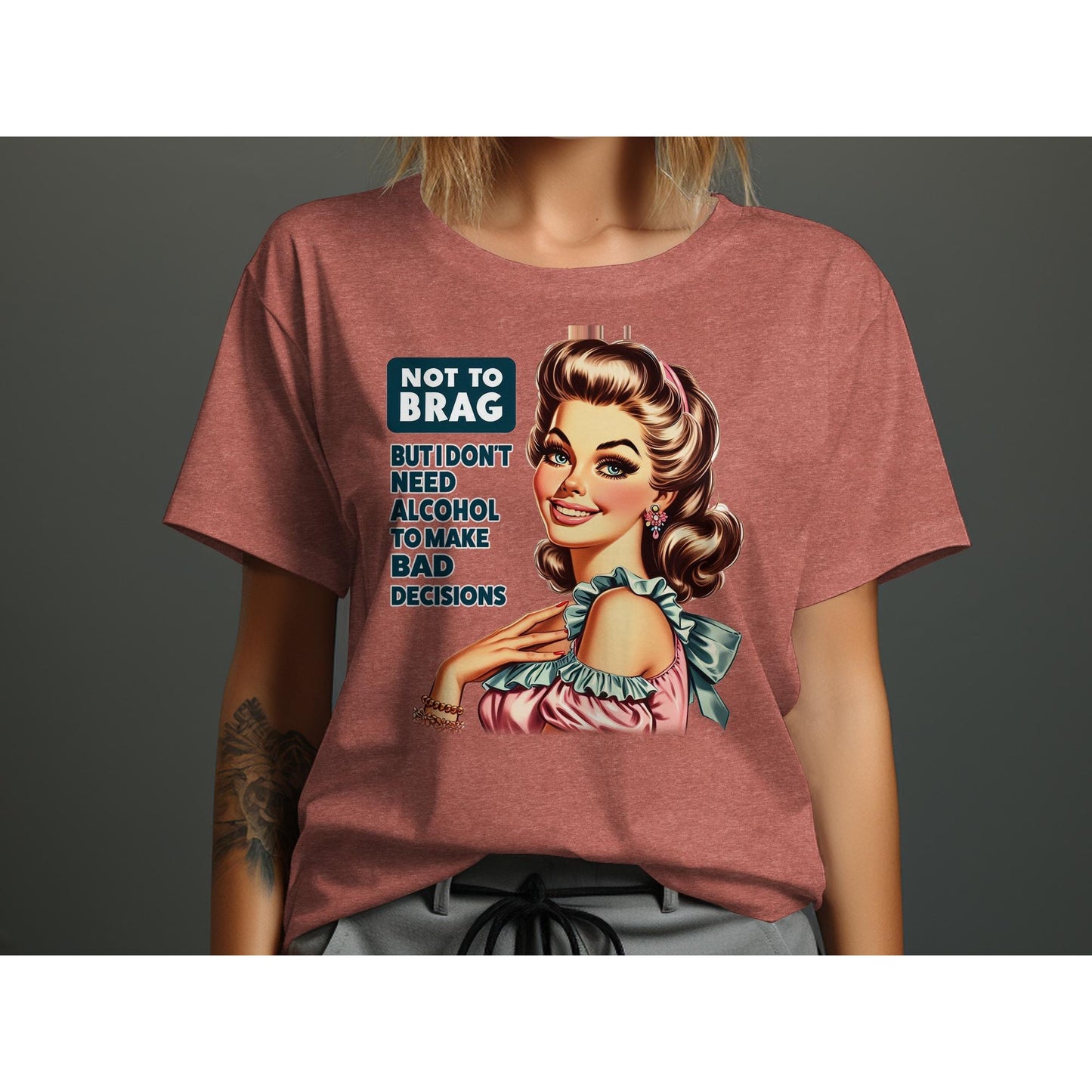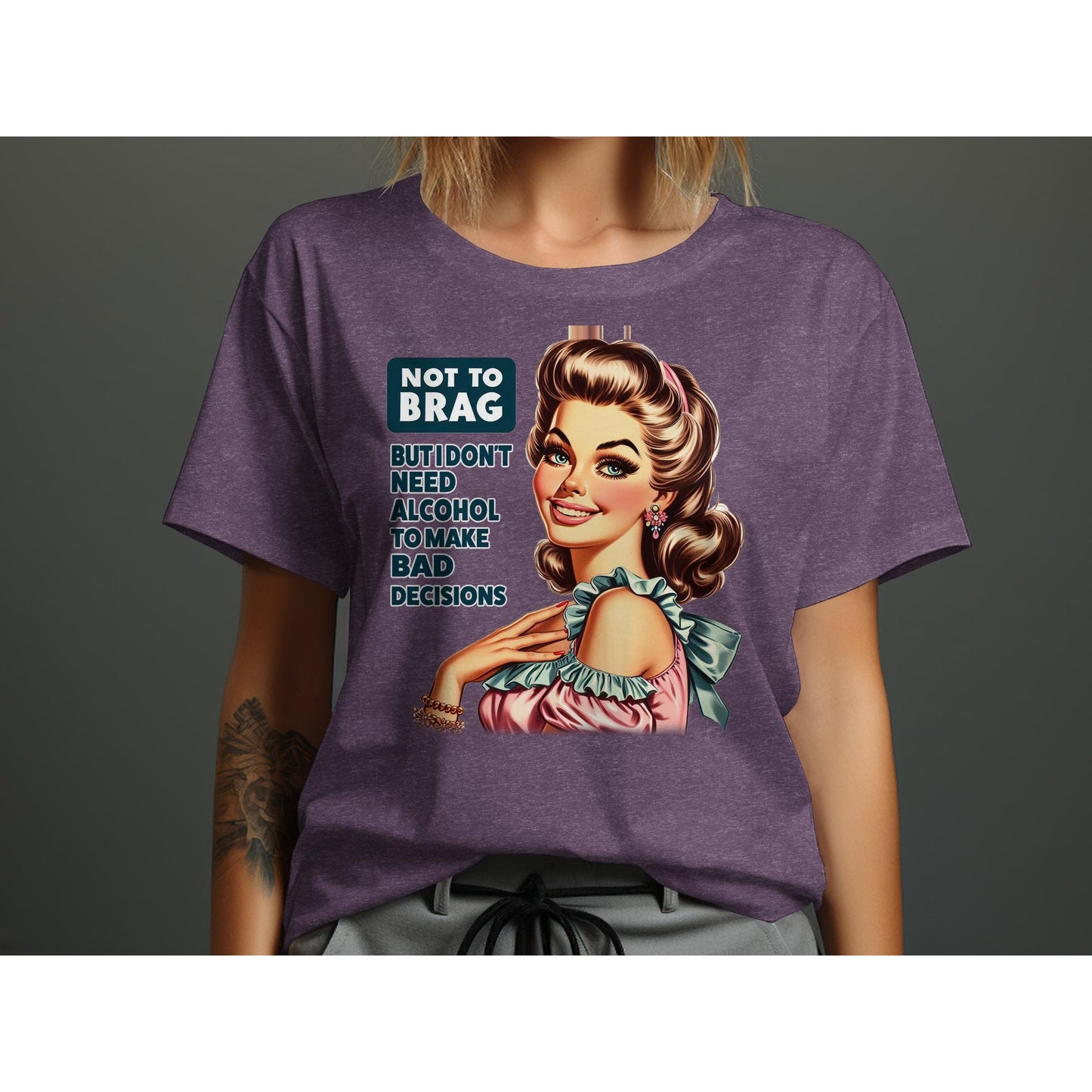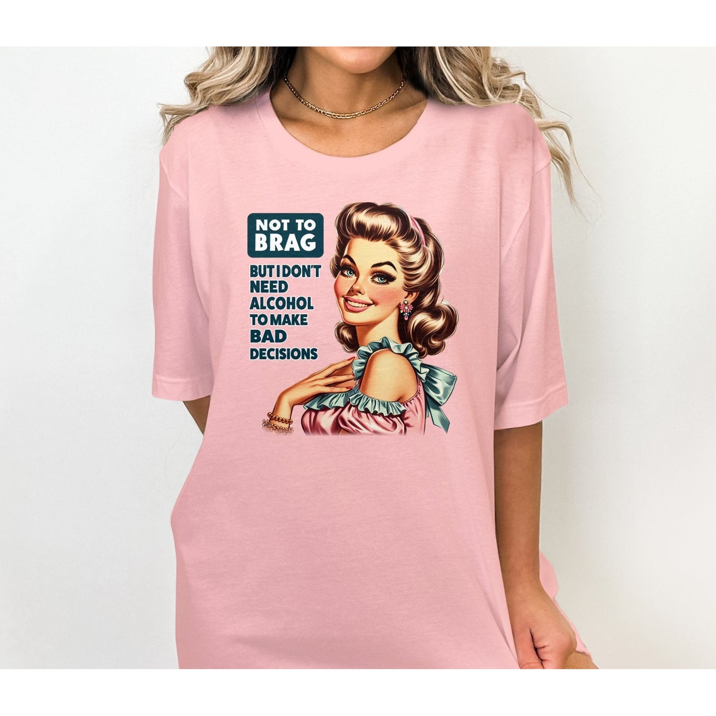 This funny vintage-style T-Shirt features the hilarious phrase "Not To Brag But I Don't Need Alcohol To Make Bad Decisions." Perfect for those who enjoy witty and humorous statements. Great for casual wear, parties, or as a fun gift.