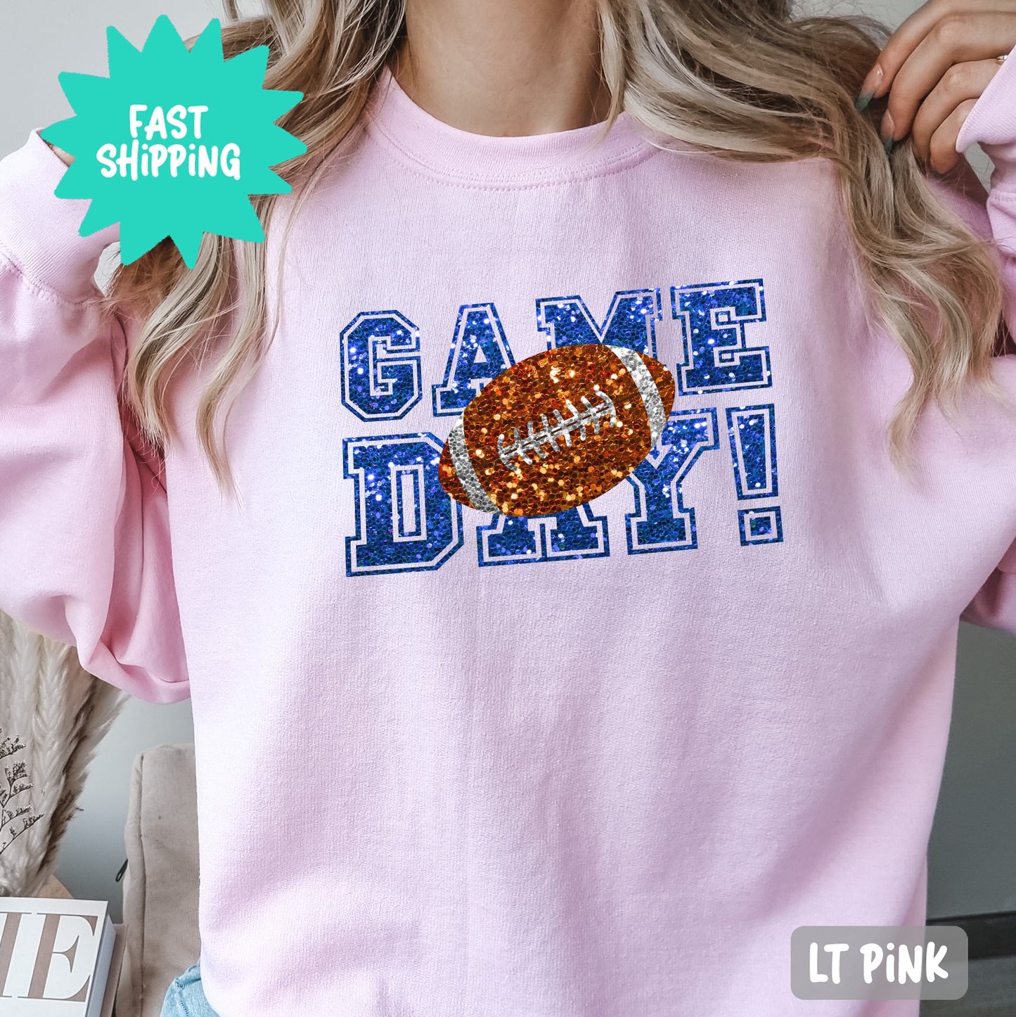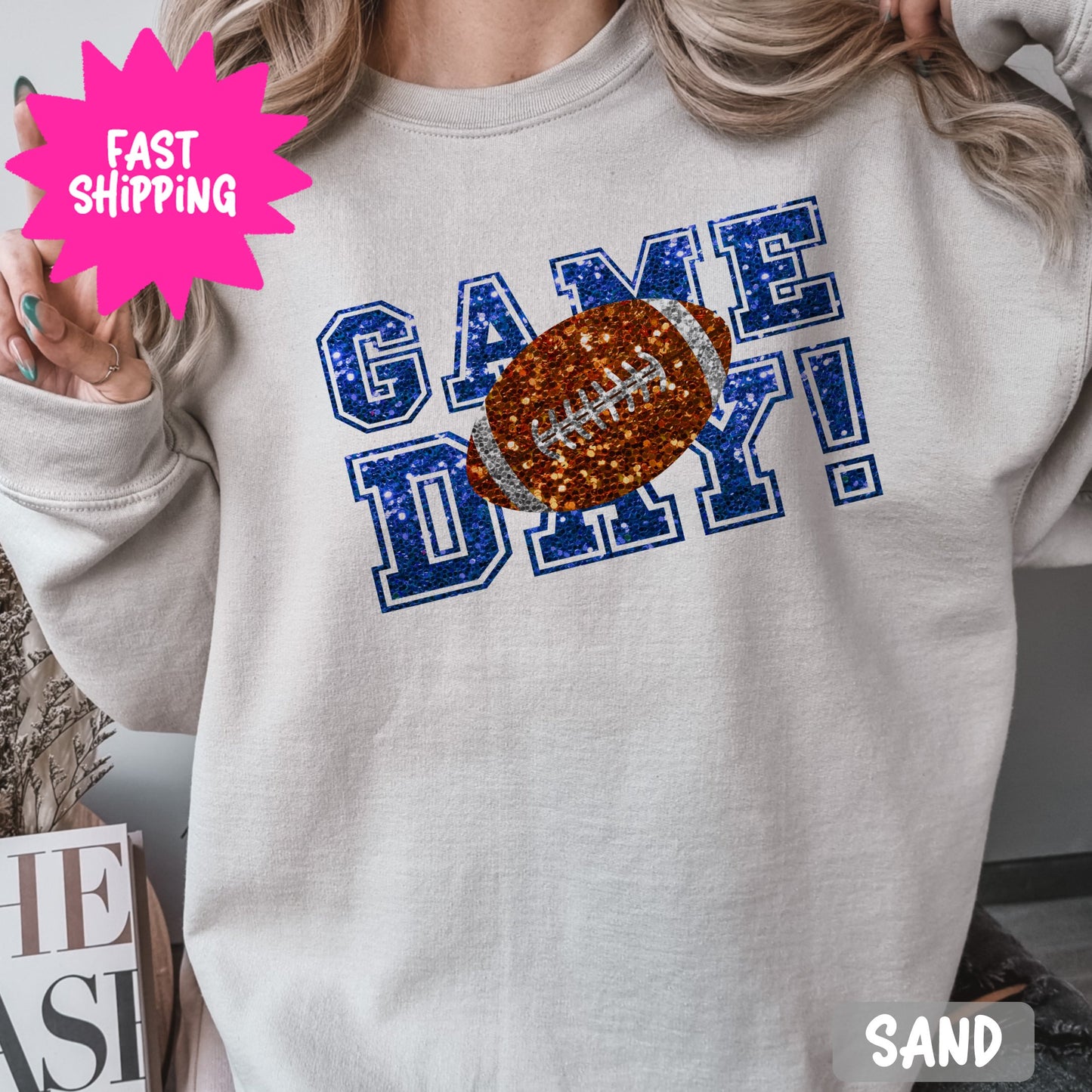 Game Day Football Crewneck Sweatshirt, Blue Glitter Letters, Comfortable and Stylish, Perfect for Sports Fans