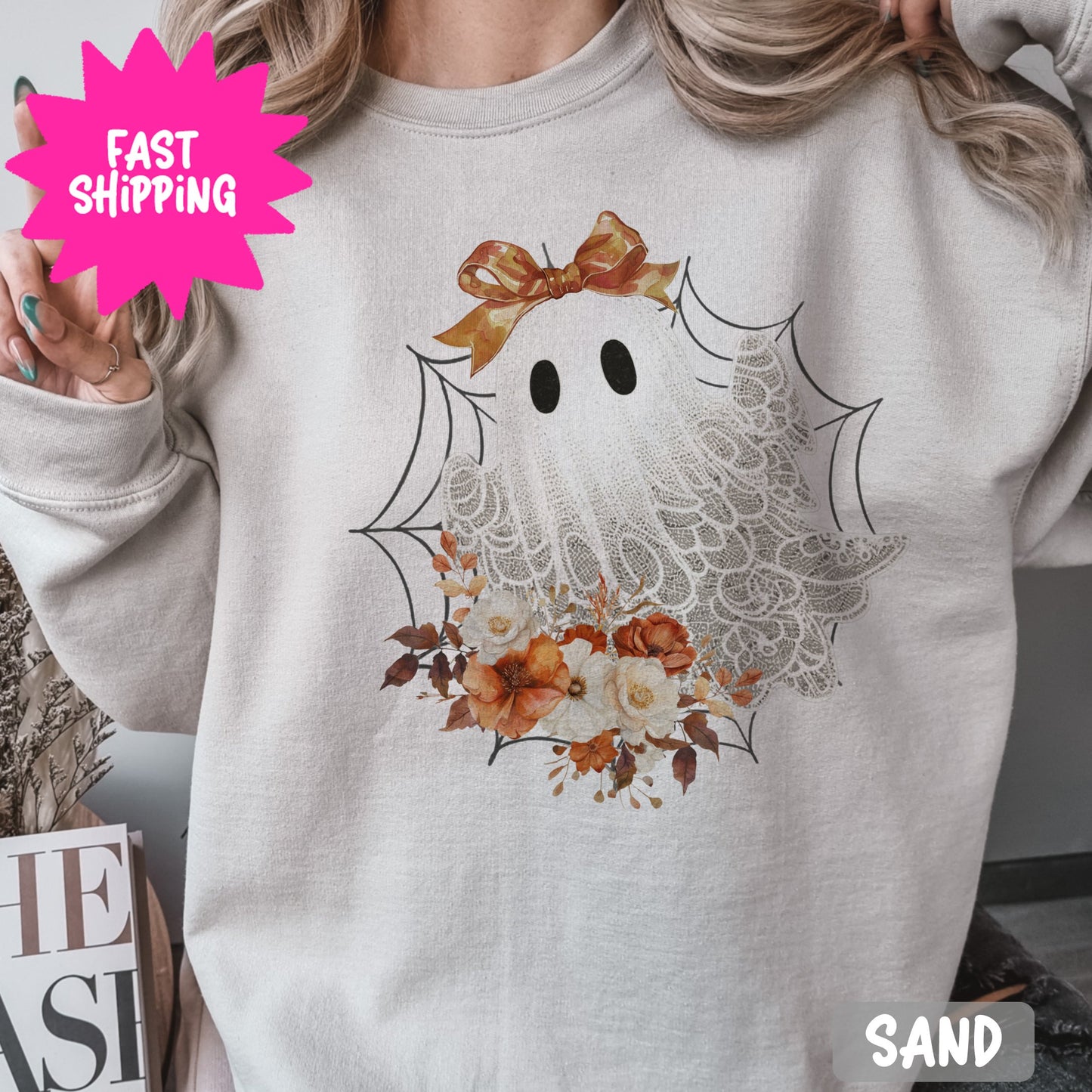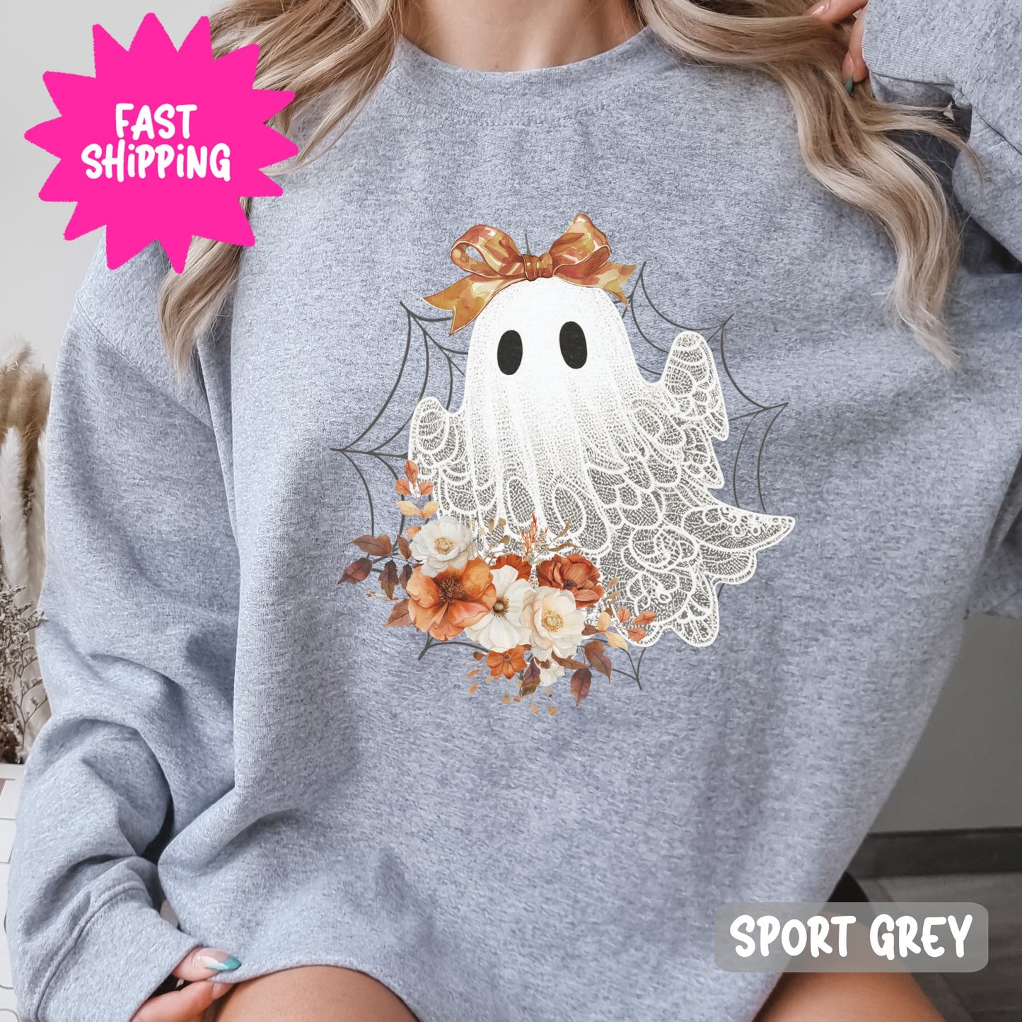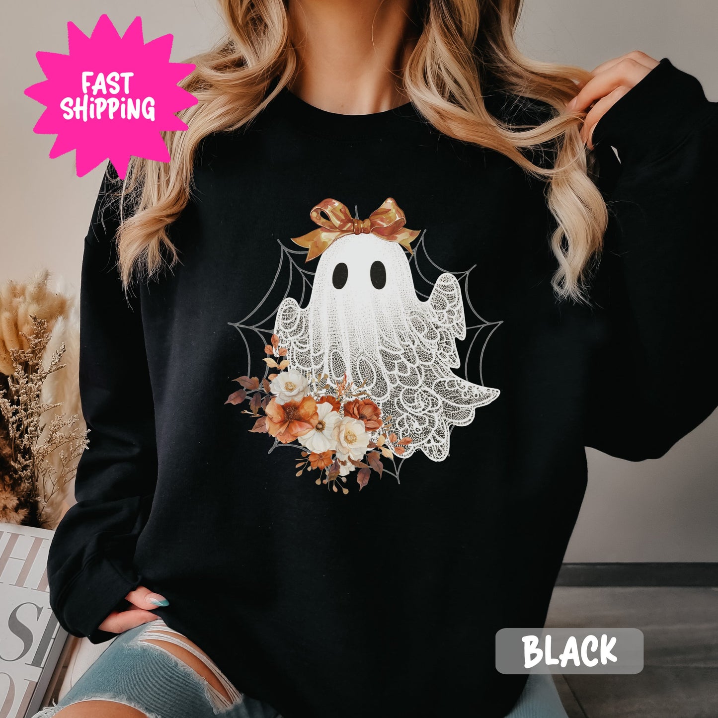 Ghost Lace Design Sweatshirt, Floral and Web Crewneck, Cute Halloween, Fall Fashion, Spooky Season Apparel