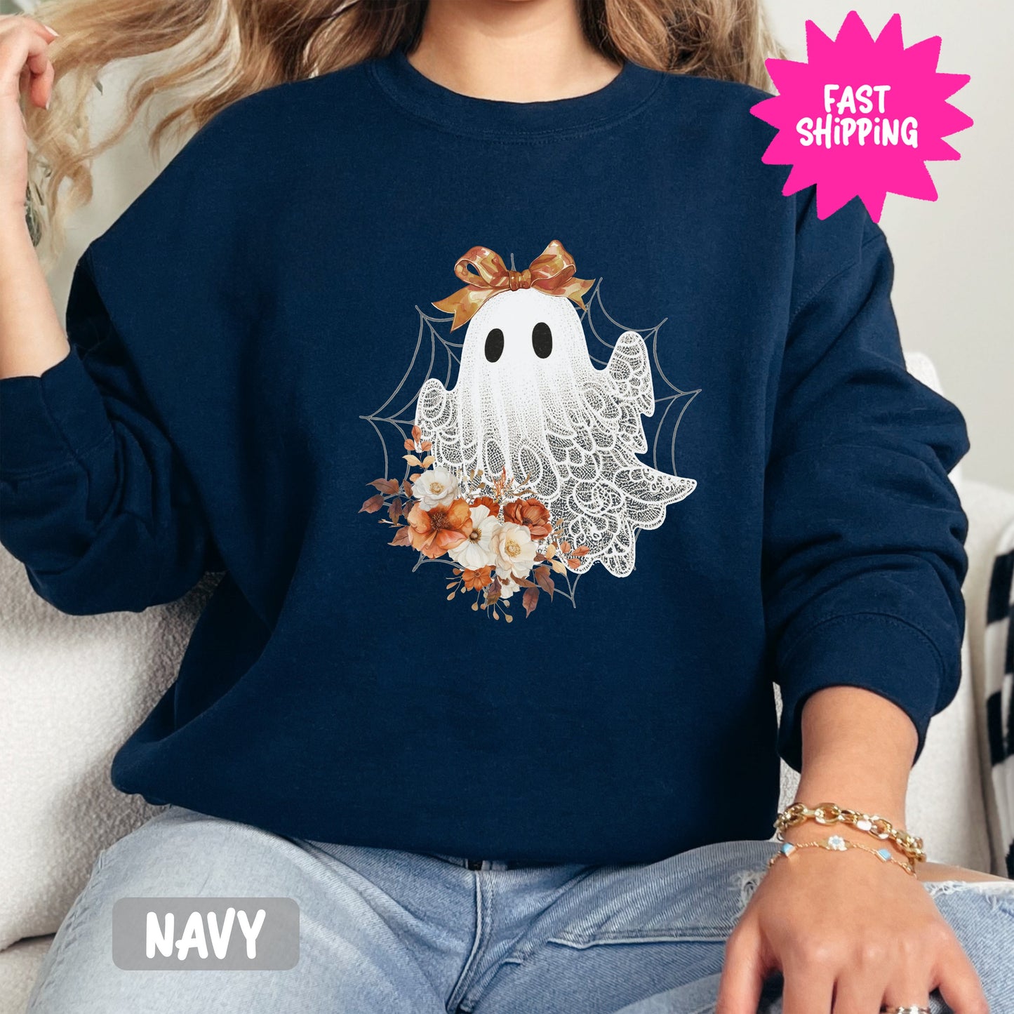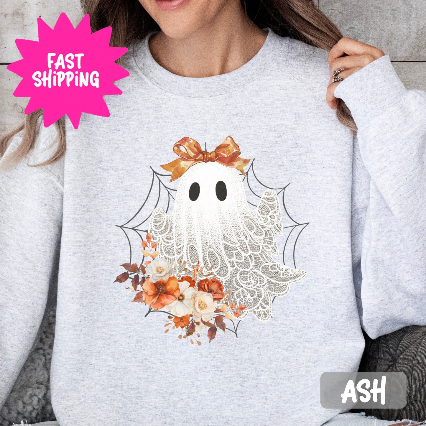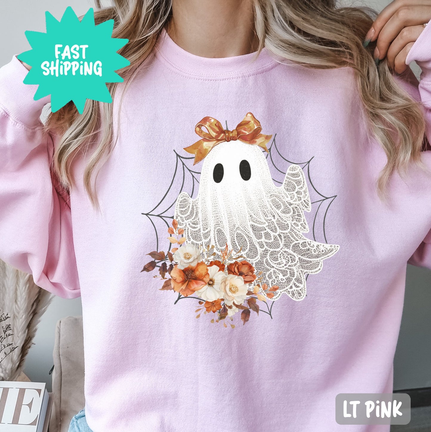 Ghost Lace Design Sweatshirt, Floral and Web Crewneck, Cute Halloween, Fall Fashion, Spooky Season Apparel