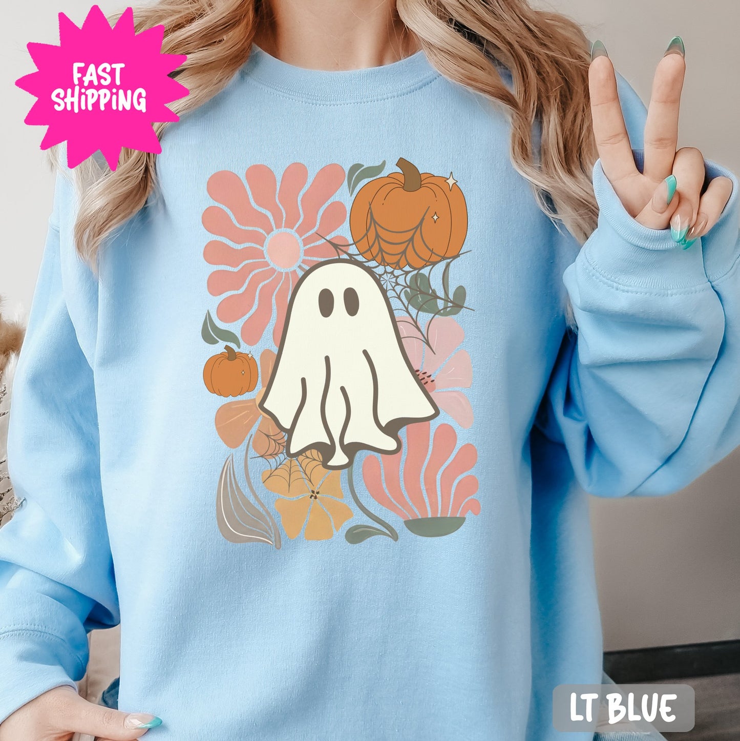 Halloween Ghost Crewneck Sweatshirt, Cute Pumpkin Graphic Sweatshirt, Fall Flower Print, Ghost Sweatshirt!