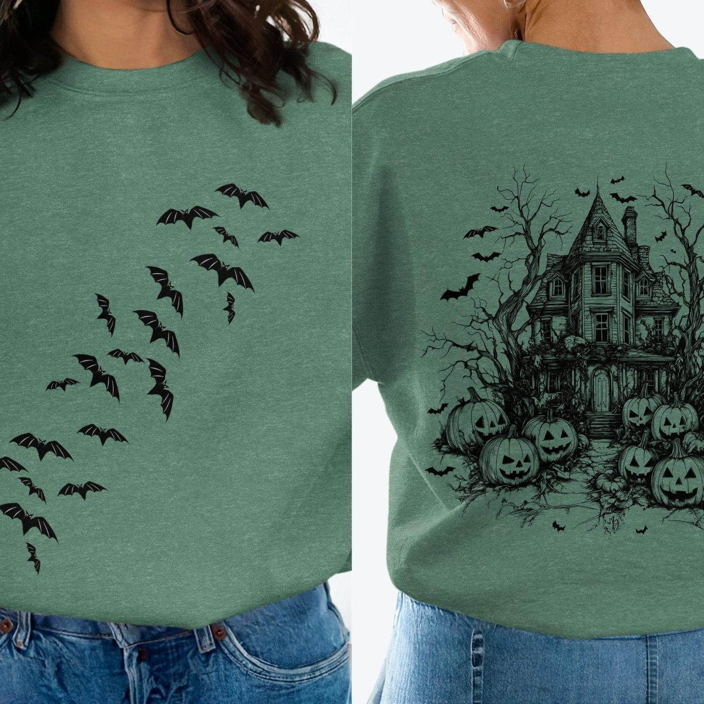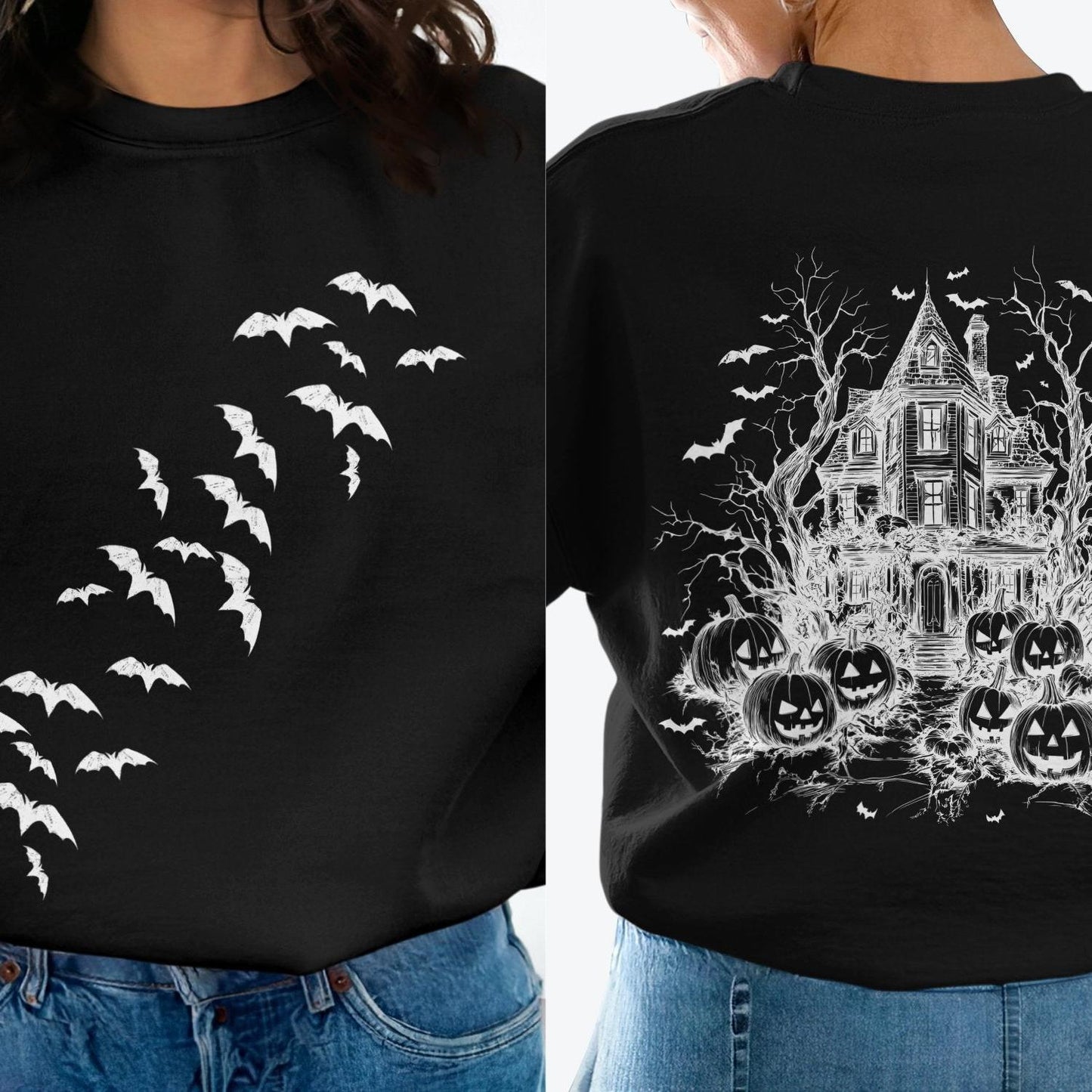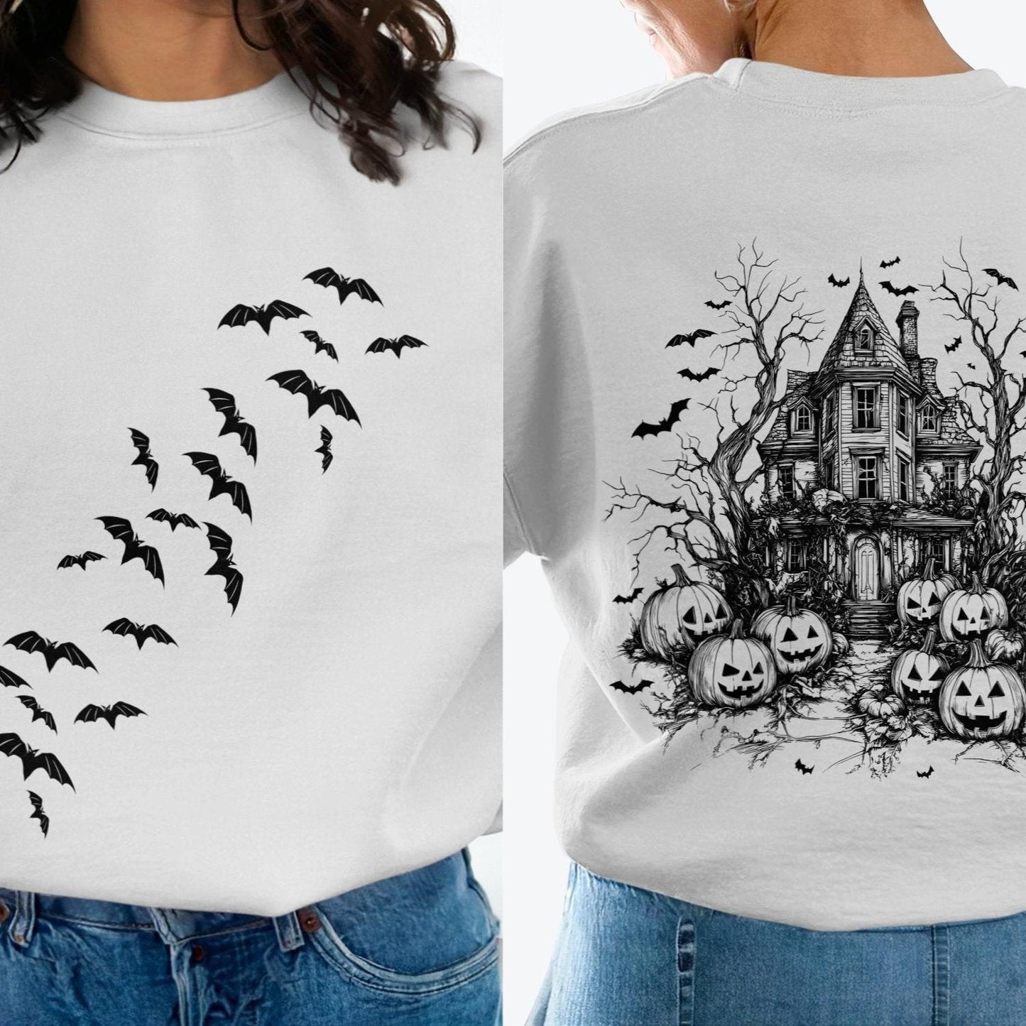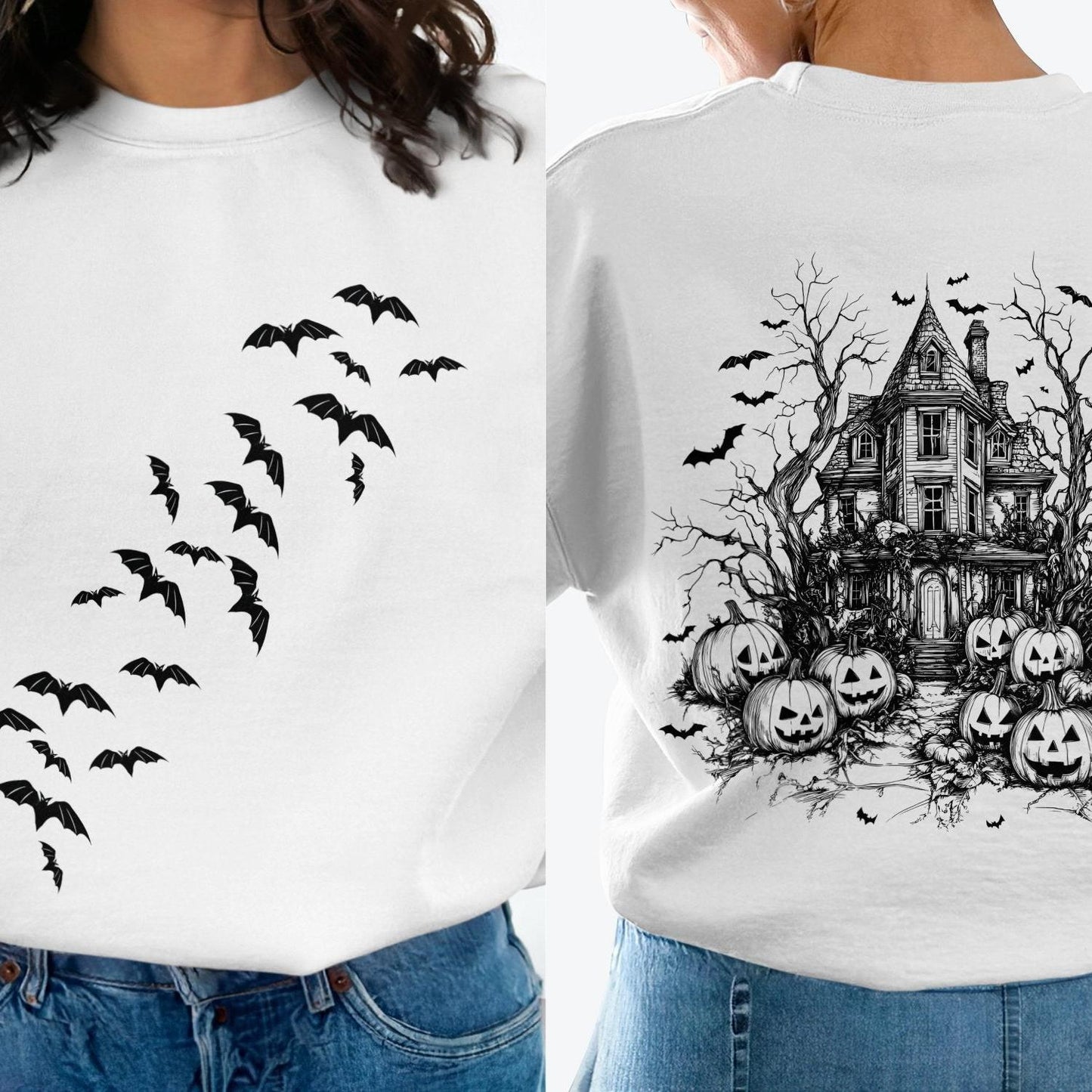 Embrace spooky vibes with these sweatshirts featuring detailed haunted house and pumpkin graphics. Perfect for Halloween festivities.